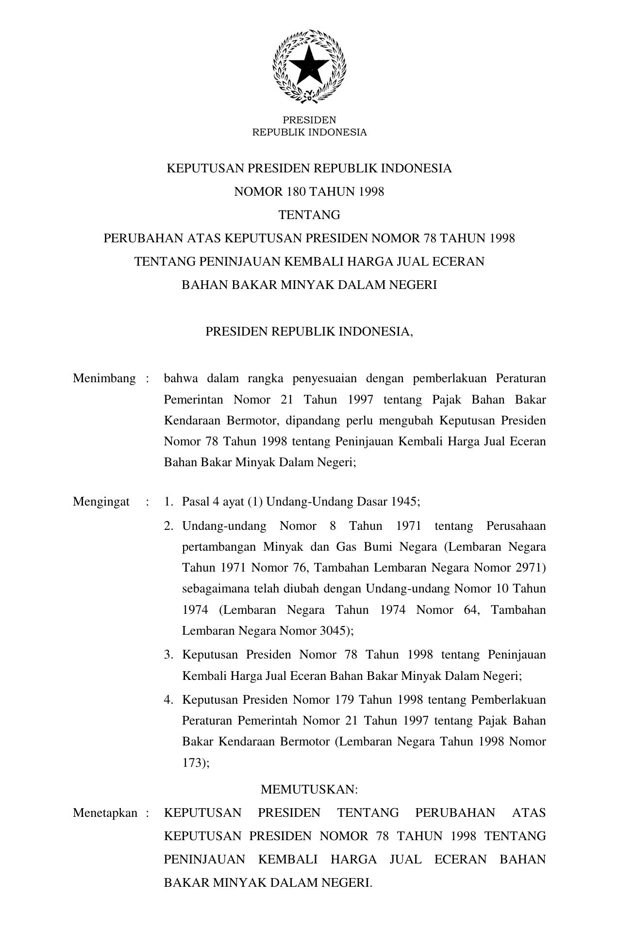 KEPPRES Nomor 180 Tahun 1998 | Keputusan Presiden Nomor 180 Tahun 1998 tentang PERUBAHAN ATAS KEPUTUSAN PRESIDEN NOMOR 78 TAHUN 1998 TENTANG PENINJAUAN KEMBALI HARGA JUAL ECERAN BAHAN BAKAR MINYAK DALAM NEGERI
