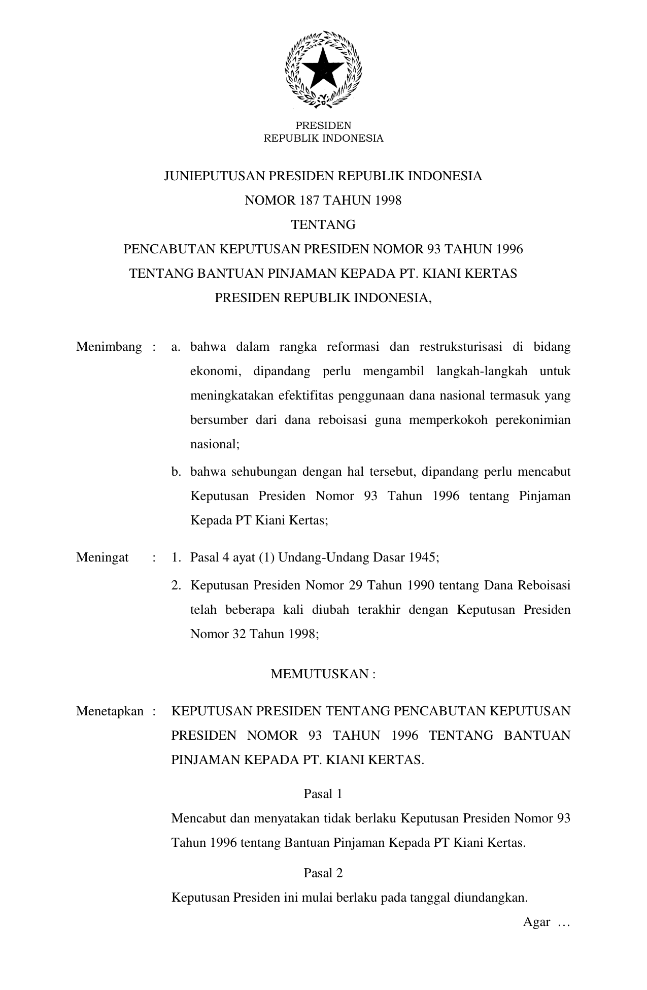 KEPPRES Nomor 187 Tahun 1998 | Keputusan Presiden Nomor 187 Tahun 1998 tentang PENCABUTAN KEPUTUSAN PRESIDEN NOMOR 93 TAHUN 1996 TENTANG BANTUAN PINJAMAN KEPADA PT. KIANI KERTAS