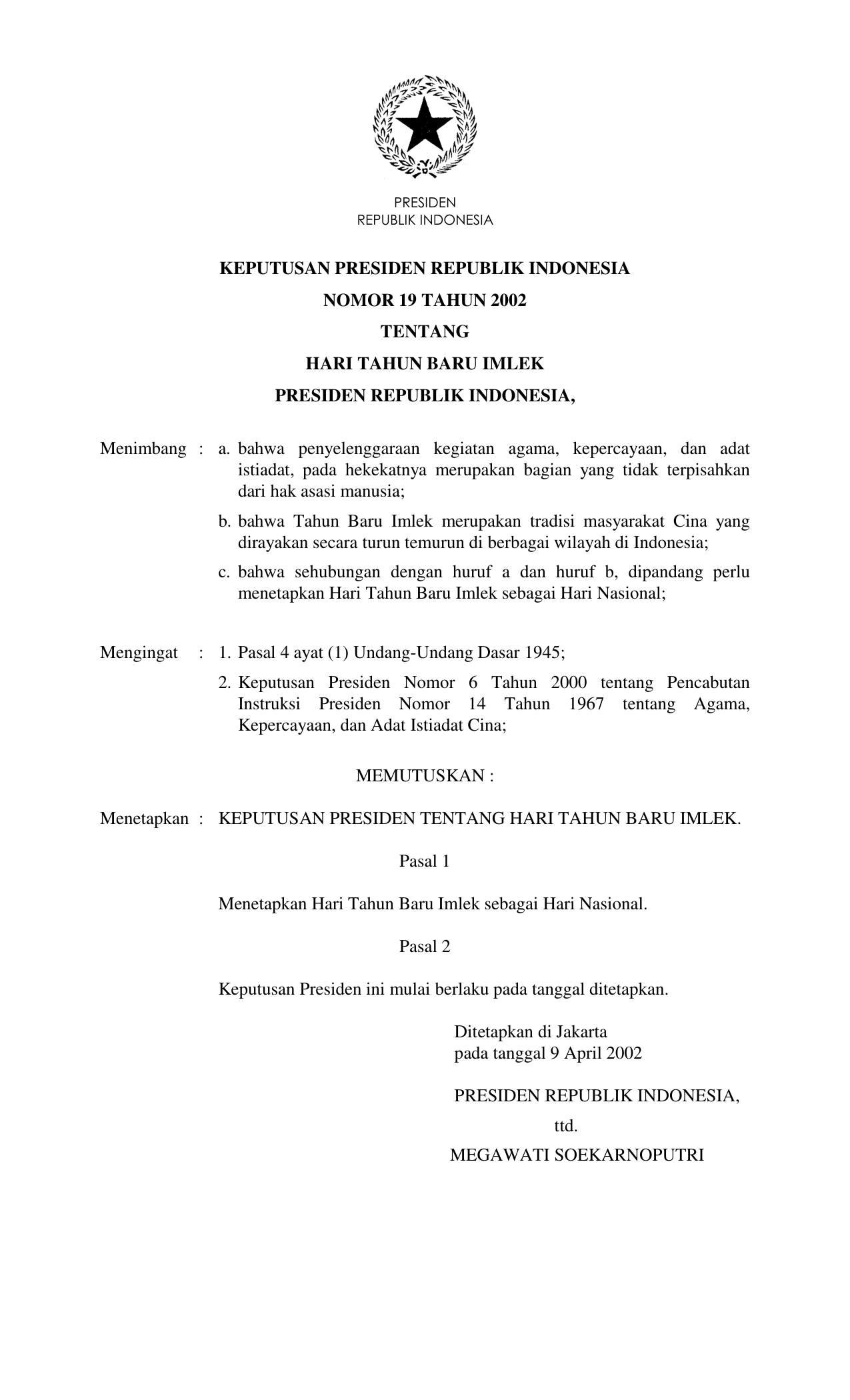 KEPPRES Nomor 19 Tahun 2002 | Keputusan Presiden Nomor 19 Tahun 2002 tentang HARI TAHUN BARU IMLEK