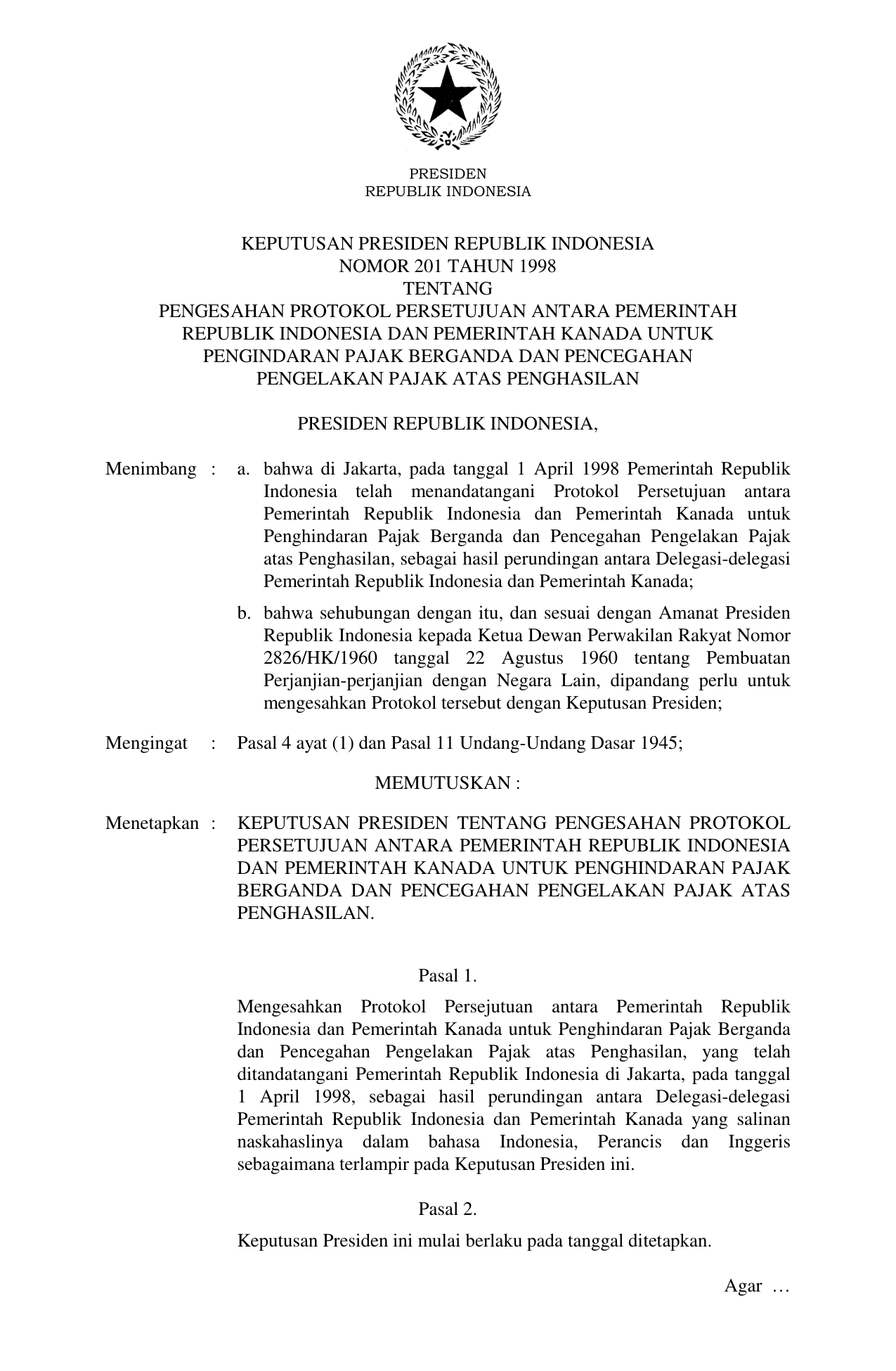 KEPPRES Nomor 201 Tahun 1998 | Keputusan Presiden Nomor 201 Tahun 1998 tentang PENGESAHAN PROTOKOL PERSETUJUAN ANTARA PEMERINTAH REPUBLIK INDONESIA DAN PEMERINTAH KANADA UNTUK PENGINDARAN PAJAK BERGANDA DAN PENCEGAHAN PENGELAKAN PAJAK ATAS PENGHASILAN