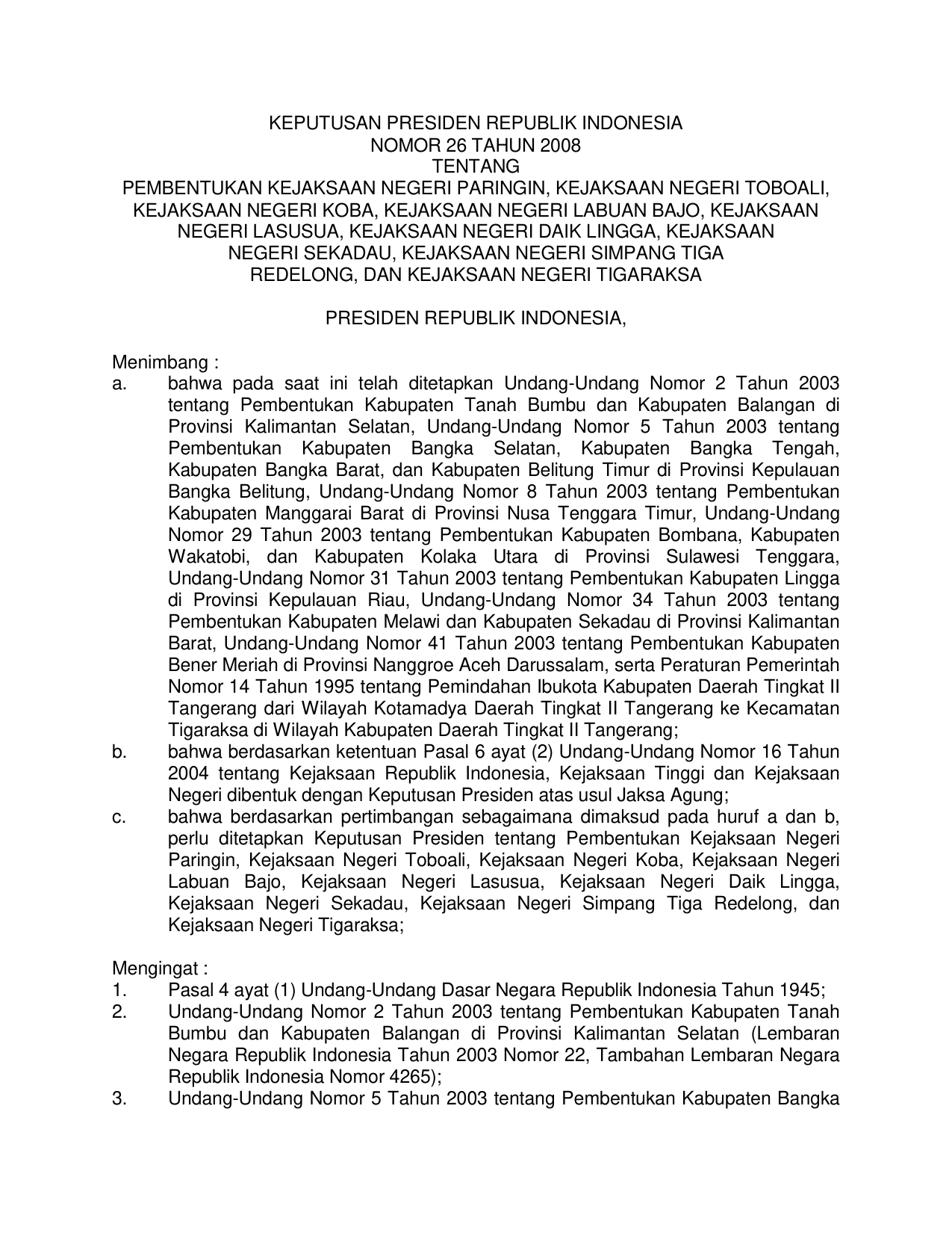 KEPPRES Nomor 26 Tahun 2008 | Keputusan Presiden Nomor 26 Tahun 2008 tentang PEMBENTUKAN KEJAKSAAN NEGERI PARINGIN, KEJAKSAAN NEGERI TOBOALI, KEJAKSAAN NEGERI KOBA, KEJAKSAAN NEGERI LABUAN BAJO, KEJAKSAAN NEGERI LASUSUA, KEJAKSAAN NEGERI DAIK LINGGA, KEJAKSAAN NEGERI SEKADAU, KEJAKSAAN NEGERI SIMPANG TIGA REDELONG, DAN KEJAKSAAN NEGERI TIGARAKSA