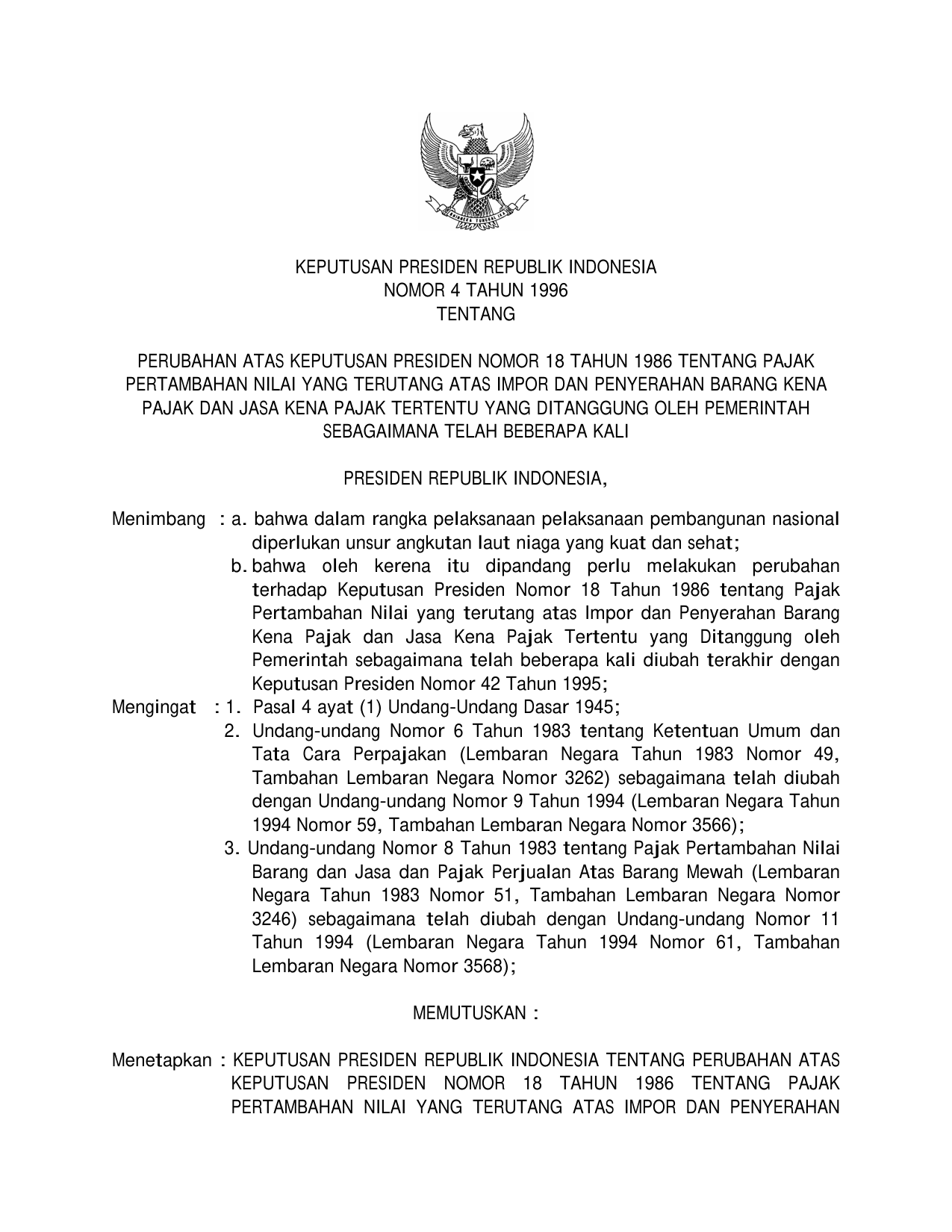 KEPPRES Nomor 4 Tahun 1996 | Keputusan Presiden Nomor 4 Tahun 1996 tentang PERUBAHAN KEPPRES 18-1986 TENTANG PAJAK PERTAMBAHAN NILAI YANG TERUTANG ATAS IMPOR DAN PENYERAHAN BARANG KENA PAJAK DAN JASA KENA PAJAK TERTENTU YANG DITANGGUNG OLEH PEMERINTAH SEBAGAIMANA TELAH BEBERAPA KALI DIUBAH TERAKHIR DENGAN KEPPRES 42-1995