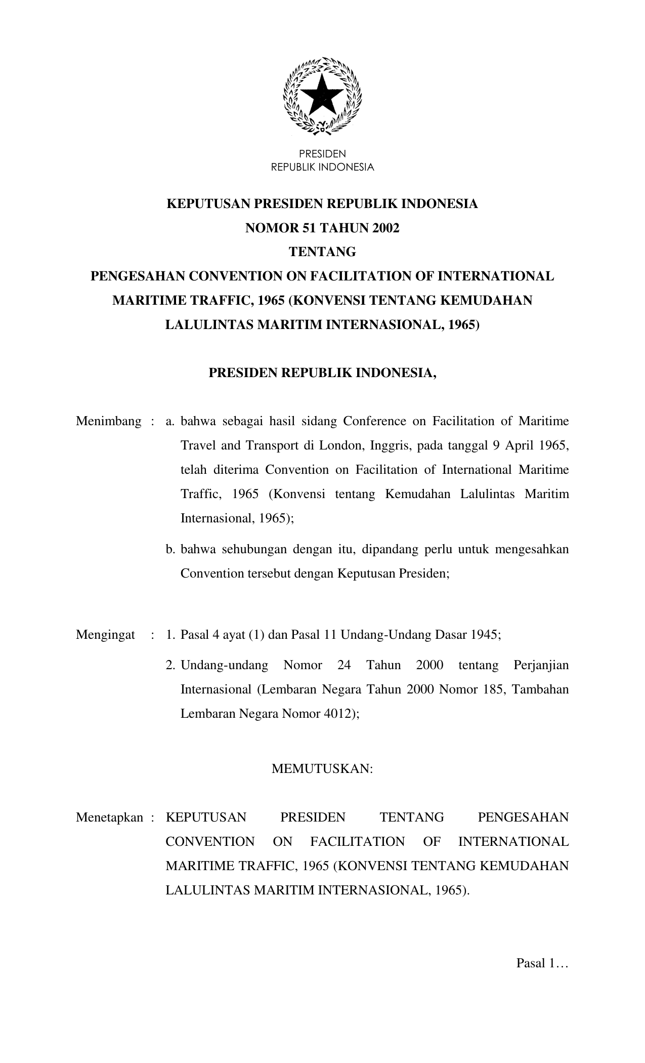 KEPPRES Nomor 51 Tahun 2002 | Keputusan Presiden Nomor 51 Tahun 2002 tentang PENGESAHAN CONVENTION ON FACILITATION OF INTERNATIONAL MARITIME TRAFFIC, 1965 (KONVENSI TENTANG KEMUDAHAN LALULINTAS MARITIM INTERNASIONAL, 1965)