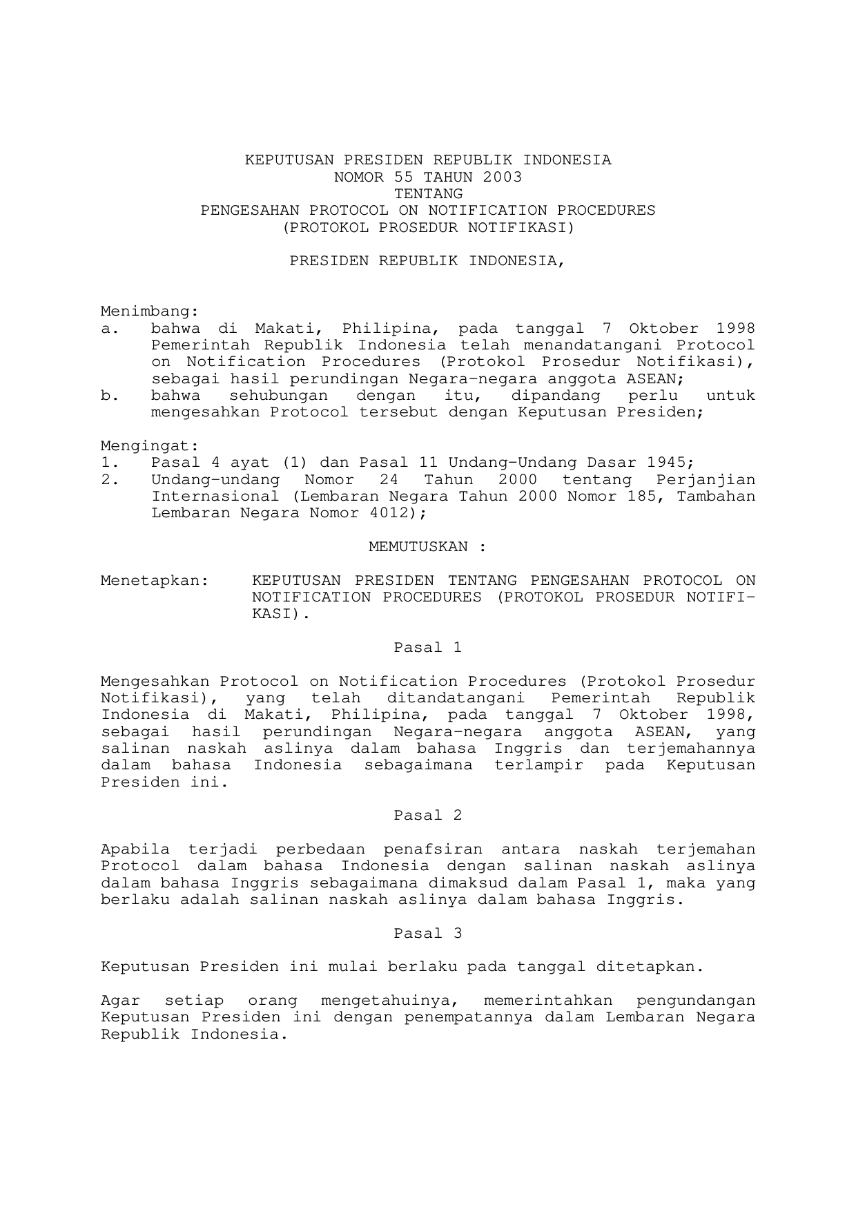 KEPPRES Nomor 55 Tahun 2003 | Keputusan Presiden Nomor 55 Tahun 2003 tentang PENGESAHAN PROTOCOL ON NOTIFICATION PROCEDURES (PROTOKOL PROSEDUR NOTIFIKASI)