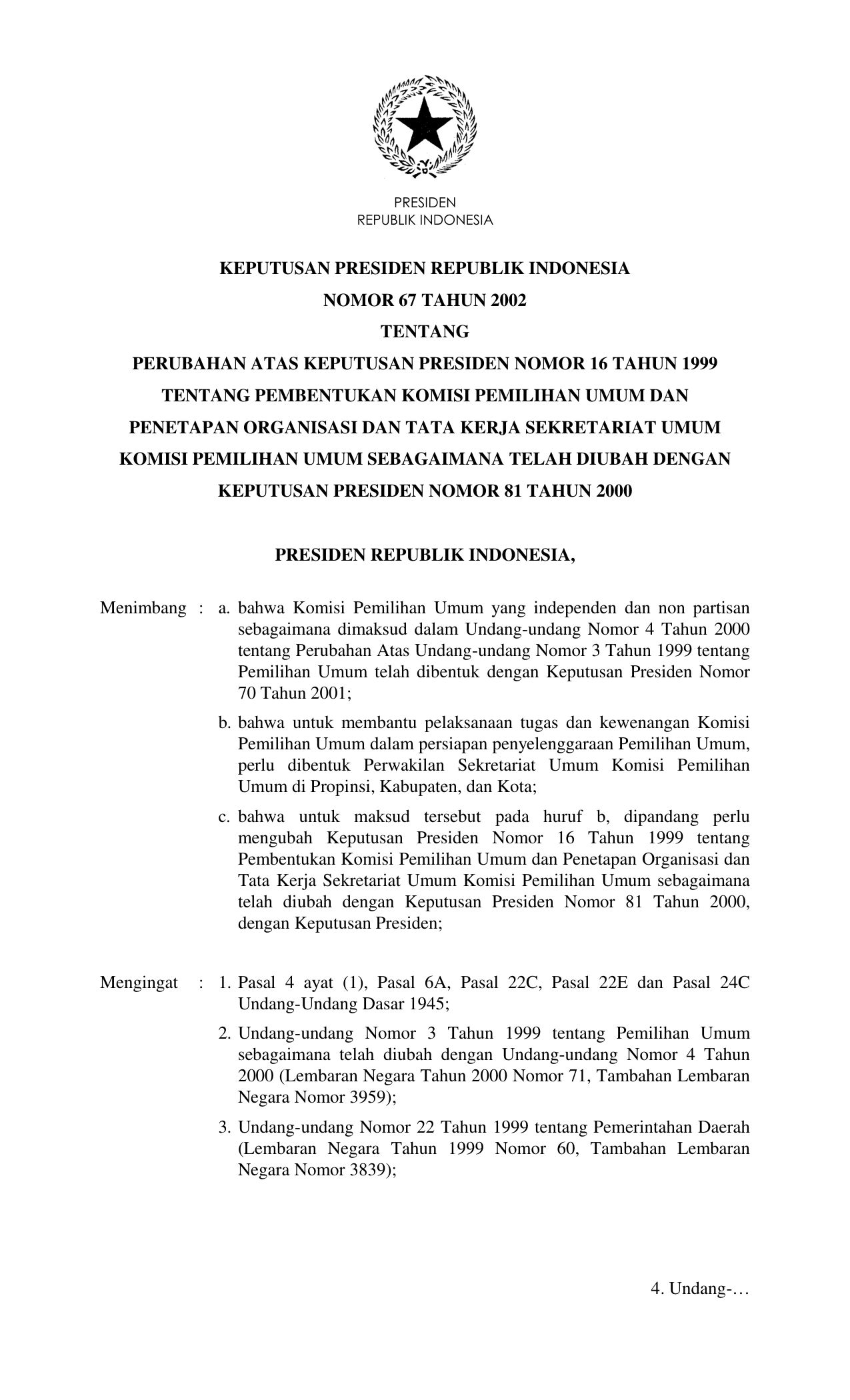 KEPPRES Nomor 67 Tahun 2002 | Keputusan Presiden Nomor 67 Tahun 2002 tentang PERUBAHAN KEPPRES 16-1999 TENTANG PEMBENTUKAN KOMISI PEMILIHAN UMUM DAN PENETAPAN ORGANISASI DAN TATA KERJA SEKRETARIAT UMUM KOMISI PEMILIHAN UMUM SEBAGAIMANA TELAH DIUBAH DENGAN KEPPRES 81-2000