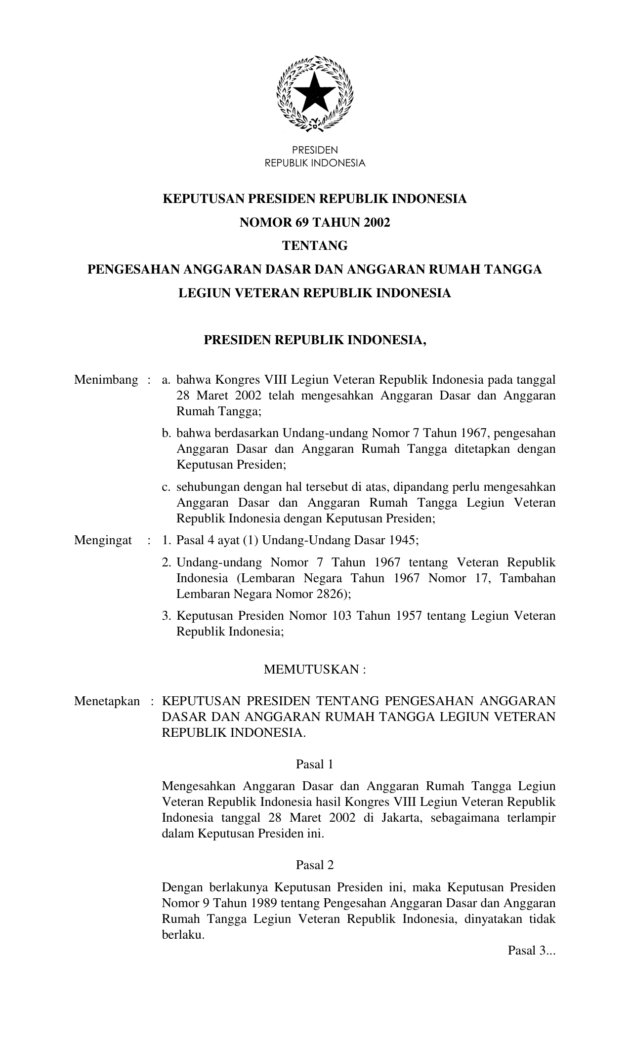 KEPPRES Nomor 69 Tahun 2002 | Keputusan Presiden Nomor 69 Tahun 2002 tentang PENGESAHAN ANGGARAN DASAR DAN ANGGARAN RUMAH TANGGA LEGIUN VETERAN RI