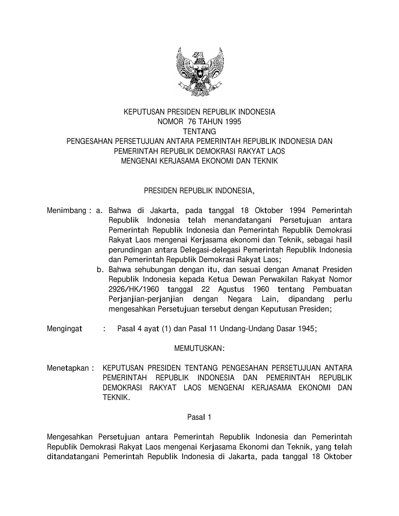 KEPPRES Nomor 76 Tahun 1995 | Keputusan Presiden Nomor 76 Tahun 1995 tentang PENGESAHAN PERSETUJUAN ANTARA PEMERINTAH RI DAN PEMERINTAH REPUBLIK DEMOKRASI RAKYAT LAOS MENGENAI KERJASAMA EKONOMI DAN TEKNIK