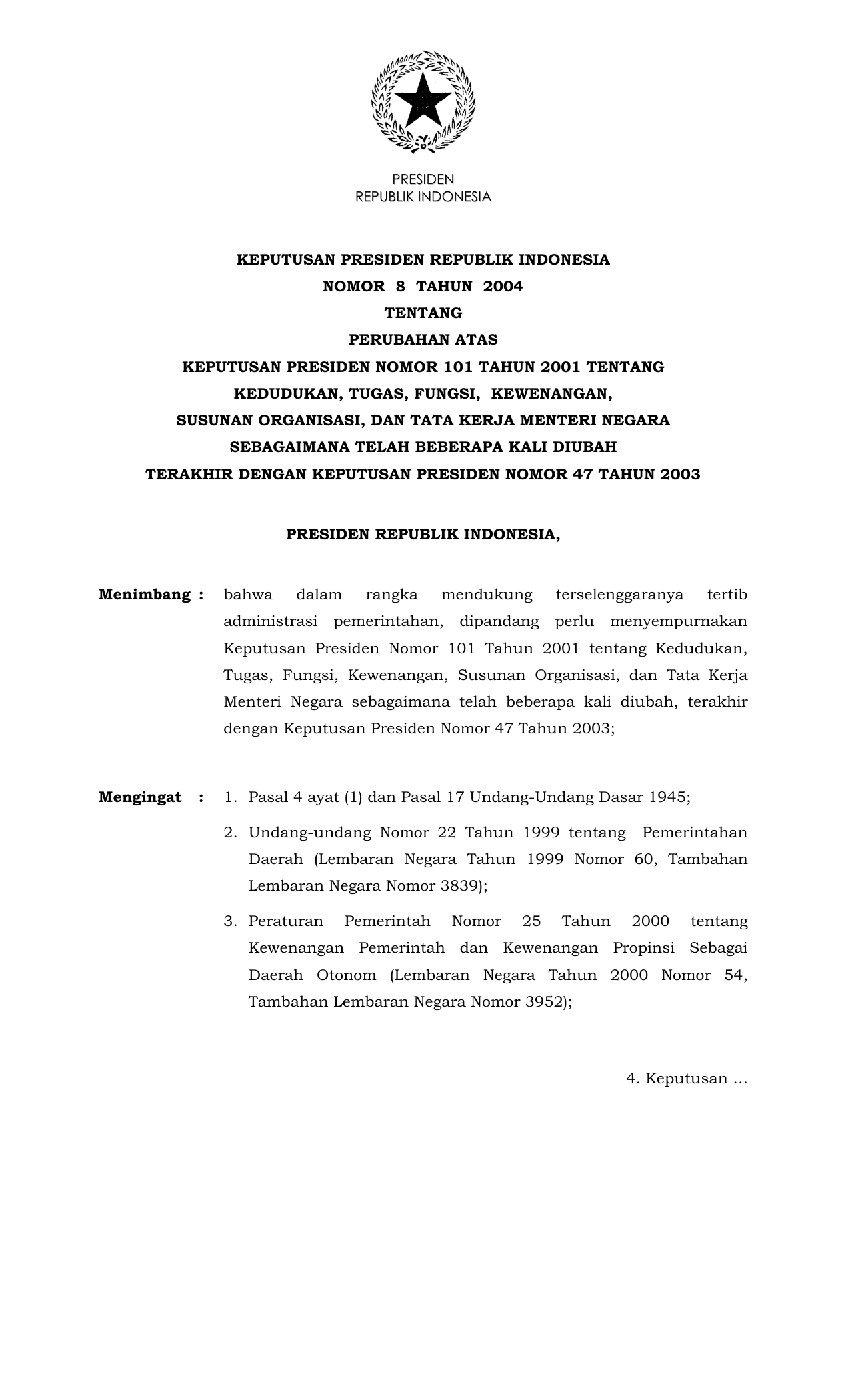 KEPPRES Nomor 8 Tahun 2004 | Keputusan Presiden Nomor 8 Tahun 2004 tentang PERUBAHAN KEPPRES 101-2001 TENTANG KEDUDUKAN, TUGAS, FUNGSI, KEWENANGAN, SUSUNAN ORGANISASI, DAN TATA KERJA MENTERI NEGARA SEBAGAIMANA TELAH BEBERAPA KALI DIUBAH TERAKHIR DENGAN KEPPRES 47-2003