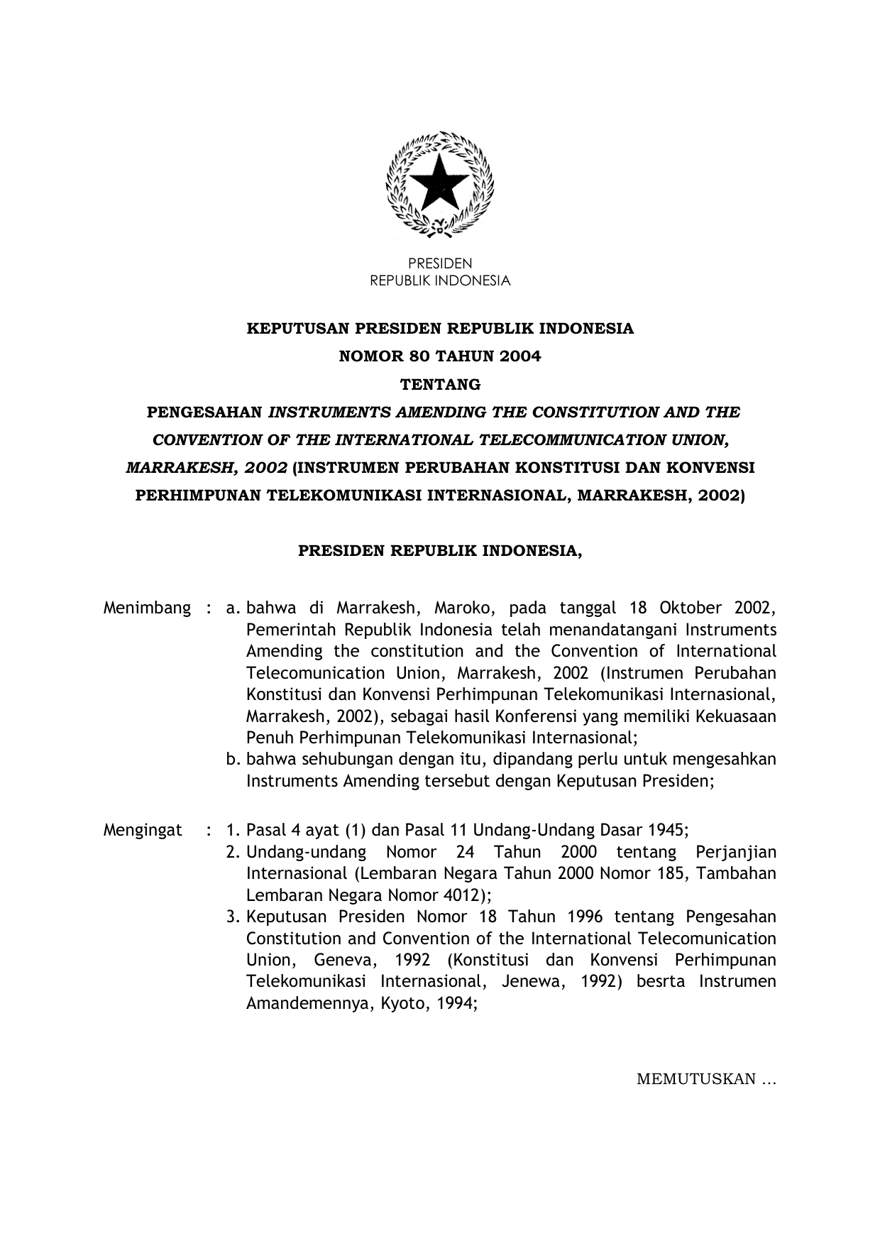 KEPPRES Nomor 80 Tahun 2004 | Keputusan Presiden Nomor 80 Tahun 2004 tentang PENGESAHAN INSTRUMENTS AMENDING THE CONSTITUTION OF THE CONVENTION OF THE INTERNATIONAL TELECOMMUNICATION UNION, MARRAKASH, 2002 (INSTRUMEN PERUBAHAN KONSTITUSI DAN KONVENSI PERHIMPUNAN TELEKOMUNIKASI INTERNASIONAL MARRAKESH, 2002)