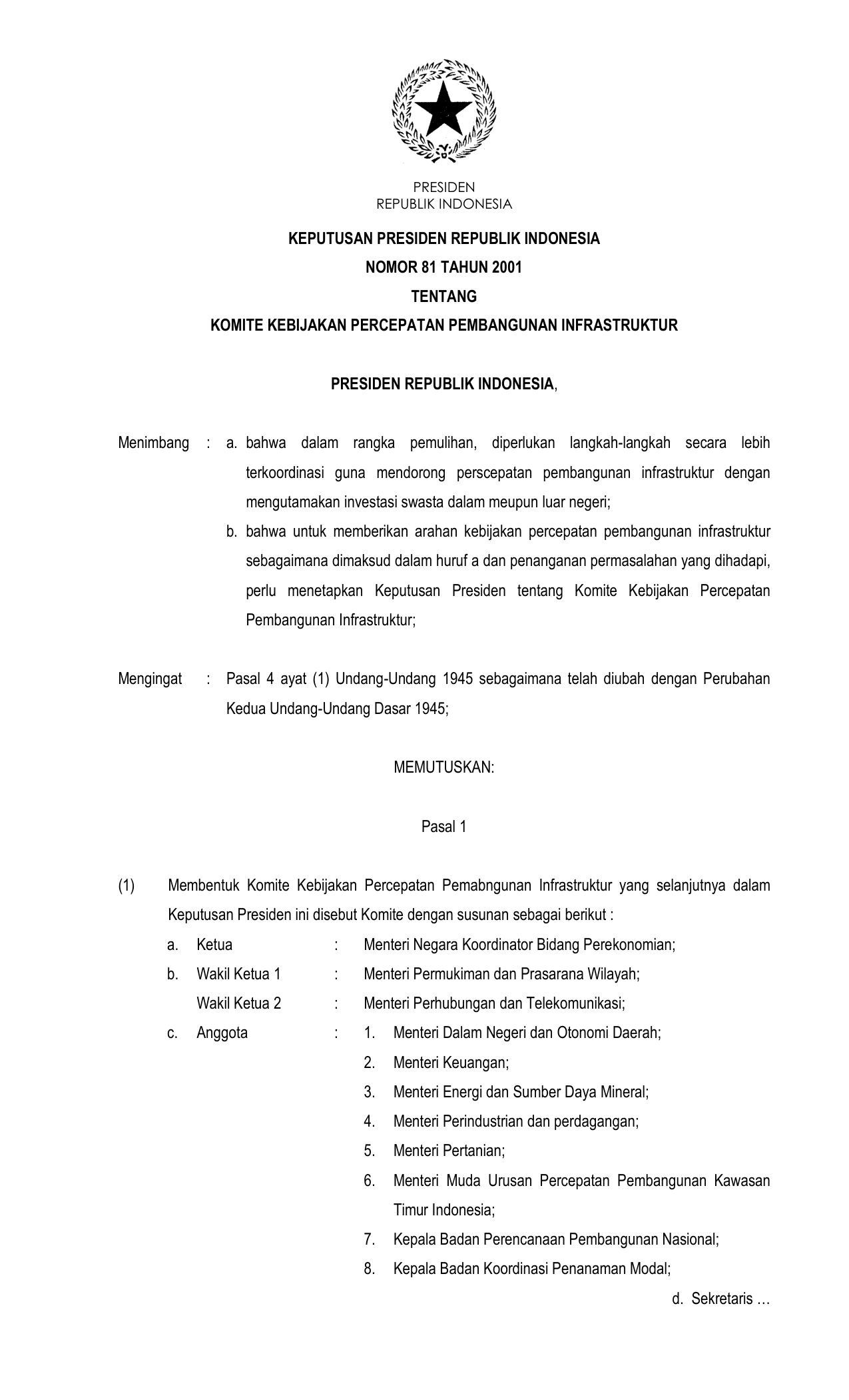 KEPPRES Nomor 81 Tahun 2001 | Keputusan Presiden Nomor 81 Tahun 2001 tentang KOMITE KEBIJAKAN PERCEPATAN PEMBANGUNAN INFRASTRUKTUR