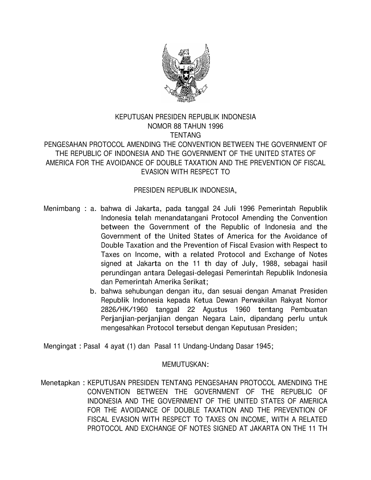 KEPPRES Nomor 88 Tahun 1996 | Keputusan Presiden Nomor 88 Tahun 1996 tentang PENGESAHAN PROTOCOL AMENDING THE CONVENTION BETWEEN THE GOVERNMENT OF THE REPUBLIC OF INDONESIA AND THE GOVERNMENT OF THE UNITED STATES OF AMERICA FOR THE AVOIDANCE OF DOUBLE TAXATION AND THE PREVENTION OF FISCAL EVASION WITH RESPECT TO TAXES ON INCOME, WITH A RELATED PROTOCOL AND EXCHANGE OF NOTES SIGNED AT