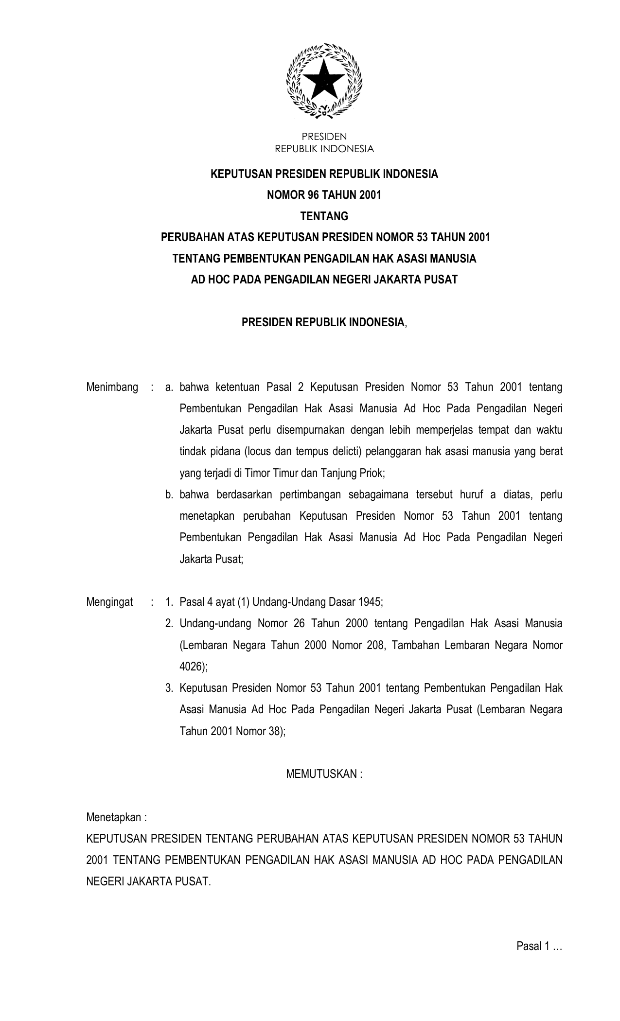 KEPPRES Nomor 96 Tahun 2001 | Keputusan Presiden Nomor 96 Tahun 2001 tentang PERUBAHAN KEPPRES 53-2001 TENTANG PEMBENTUKAN PENGADILAN HAK ASASI MANUSIA AD HOC PADA PENGADILAN NEGERI JAKARTA PUSAT