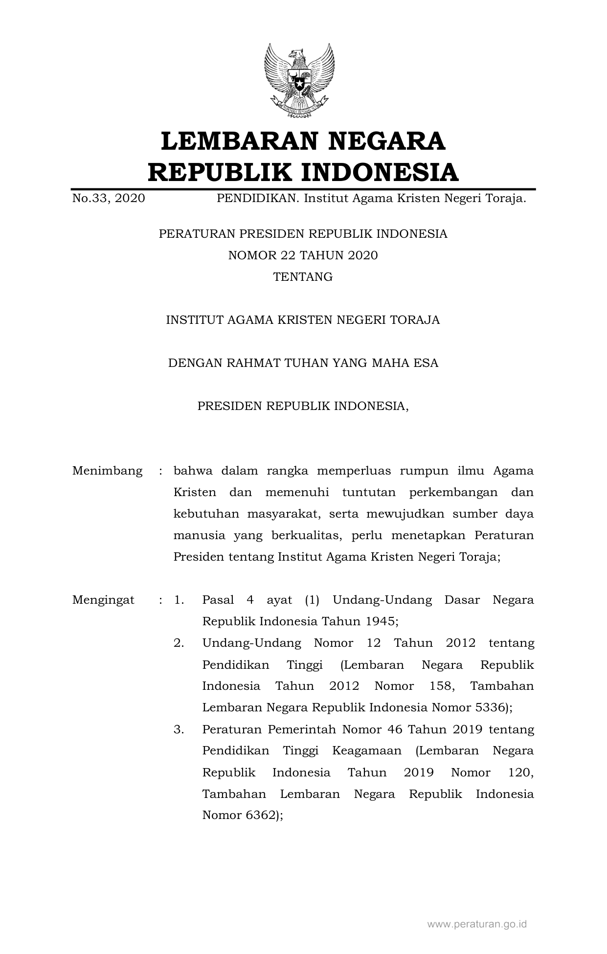KEPPRES Nomor 22 Tahun 2020 | Keputusan Presiden Nomor 22 Tahun 2020 tentang INSTITUT AGAMA KRISTEN NEGERI TORAJA