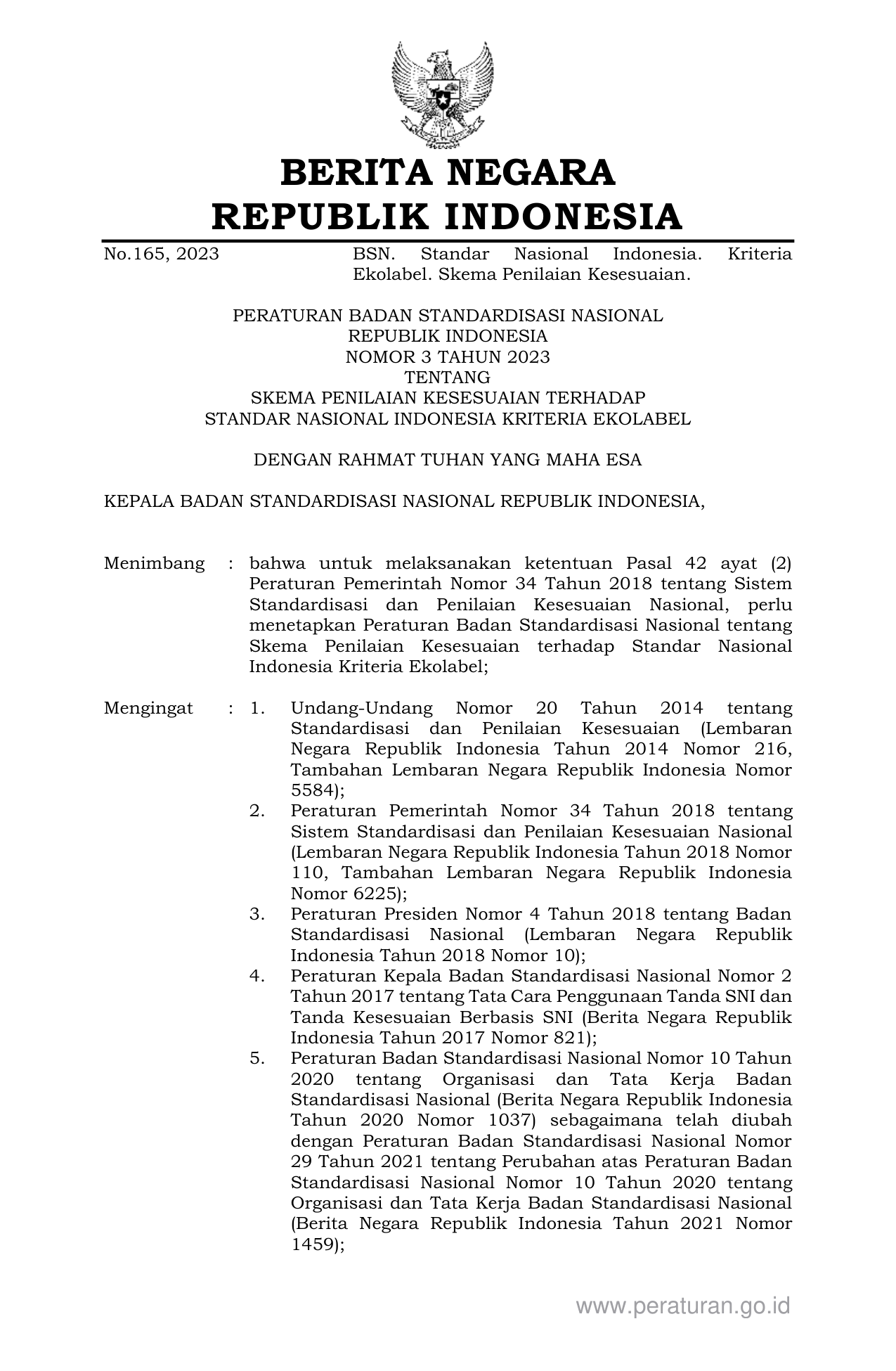 PERBAN Nomor 3 Tahun 2023 | Peraturan Badan Nomor 3 Tahun 2023 tentang SKEMA PENILAIAN KESESUAIAN TERHADAP STANDAR NASIONAL INDONESIA KRITERIA EKOLABEL