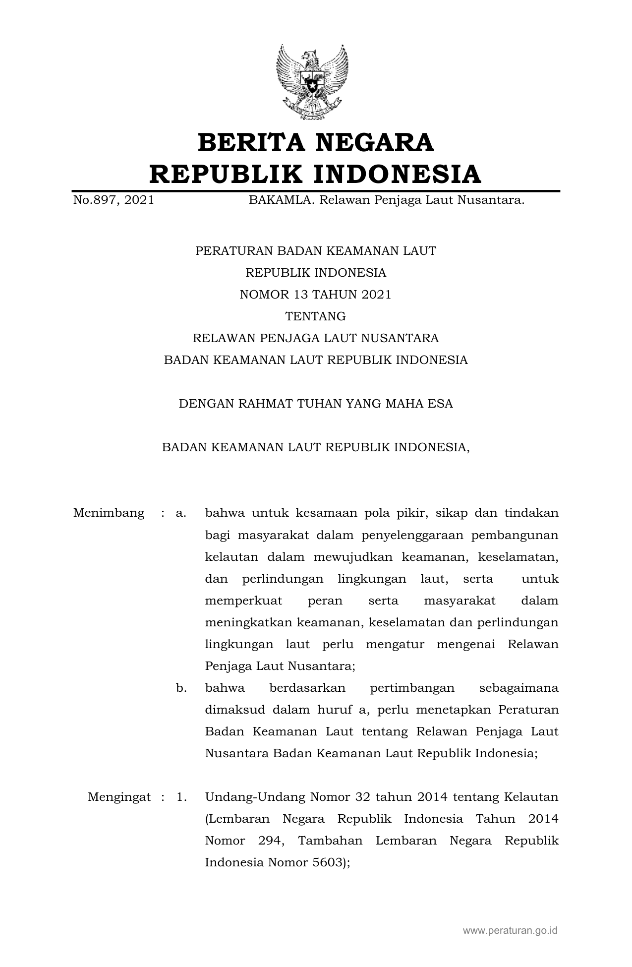 PERBAN Nomor 13 Tahun 2021 | Peraturan Badan Nomor 13 Tahun 2021 tentang RELAWAN PENJAGA LAUT NUSANTARA BADAN KEAMANAN LAUT REPUBLIK INDONESIA