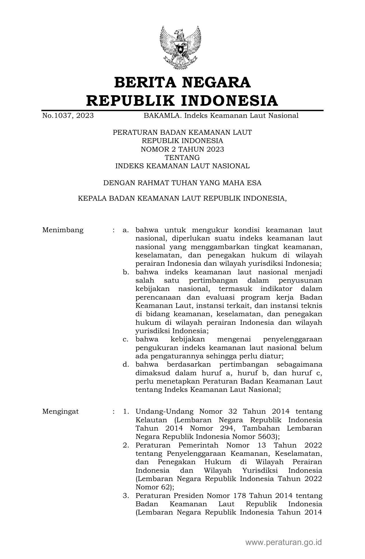PERBAN Nomor 2 Tahun 2023 | Peraturan Badan Nomor 2 Tahun 2023 tentang INDEKS KEAMANAN LAUT NASIONAL