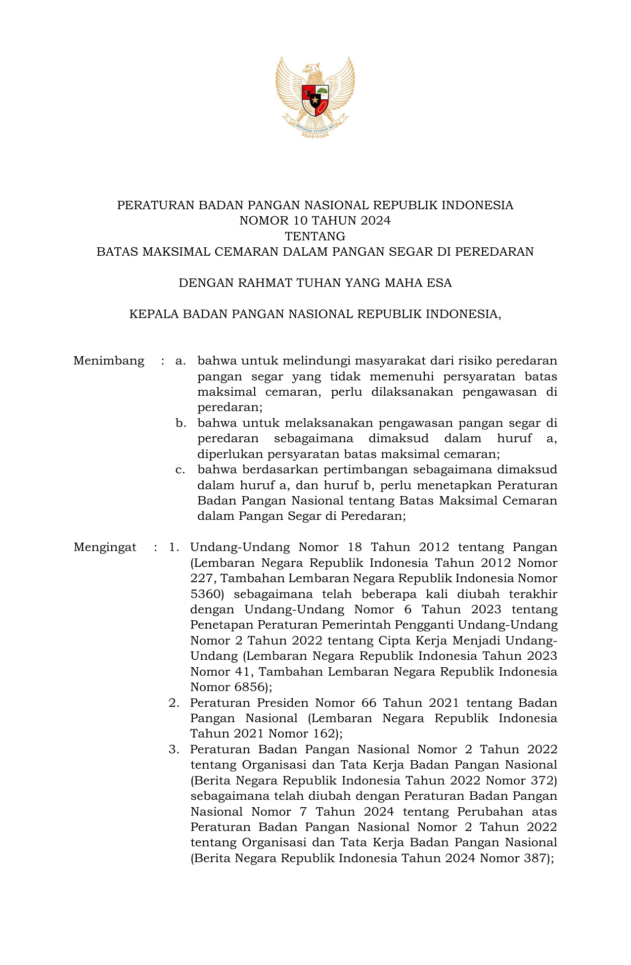 PERBAN Nomor 10 Tahun 2024 | Peraturan Badan Nomor 10 Tahun 2024 tentang BATAS MAKSIMAL CEMARAN DALAM PANGAN SEGAR DI PEREDARAN