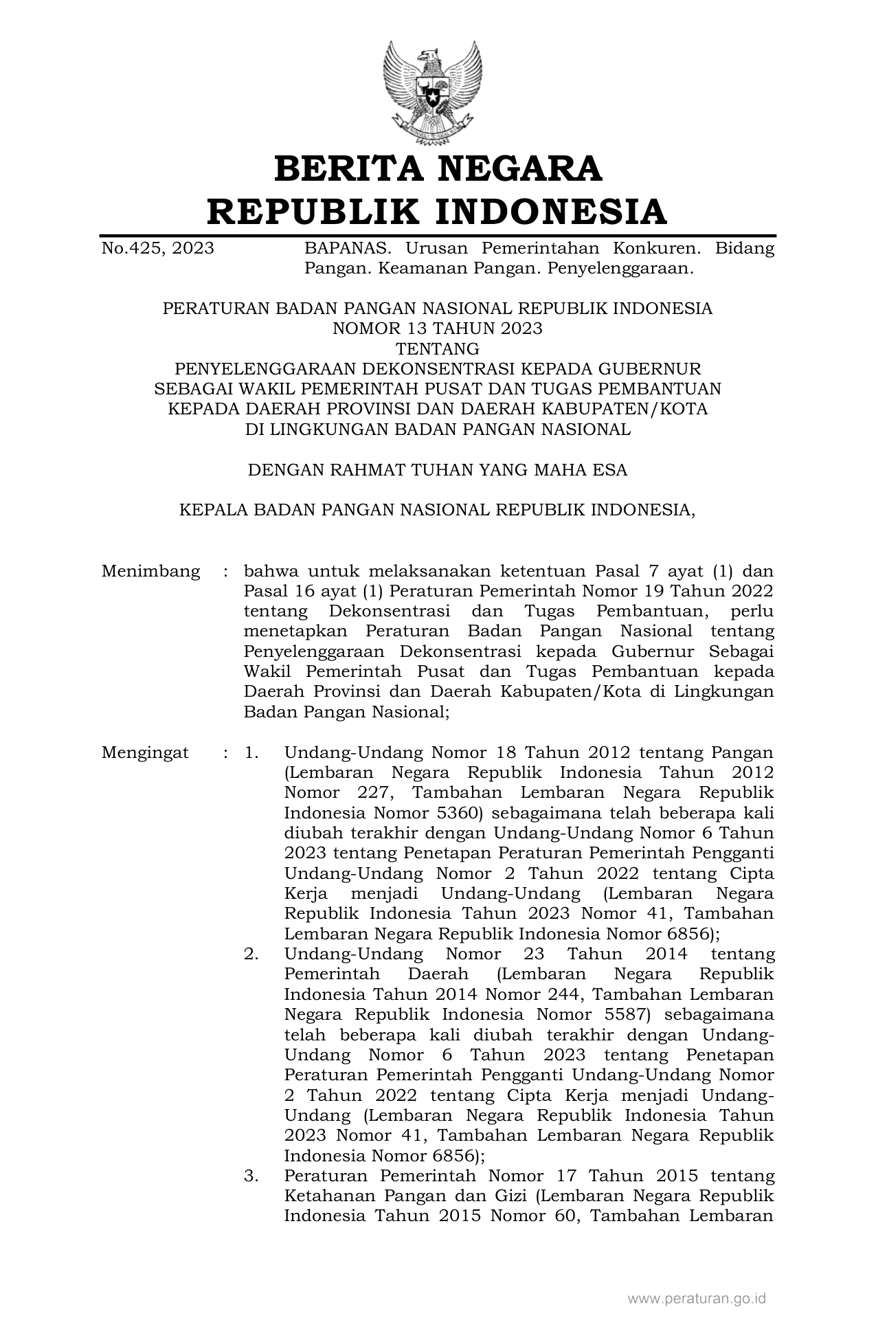 PERBAN Nomor 13 Tahun 2023 | Peraturan Badan Nomor 13 Tahun 2023 tentang PENYELENGGARAAN DEKONSENTRASI KEPADA GUBERNUR SEBAGAI WAKIL PEMERINTAH PUSAT DAN TUGAS PEMBANTUAN KEPADA DAERAH PROVINSI DAN DAERAH KABUPATEN/KOTA DI LINGKUNGAN BADAN PANGAN NASIONAL
