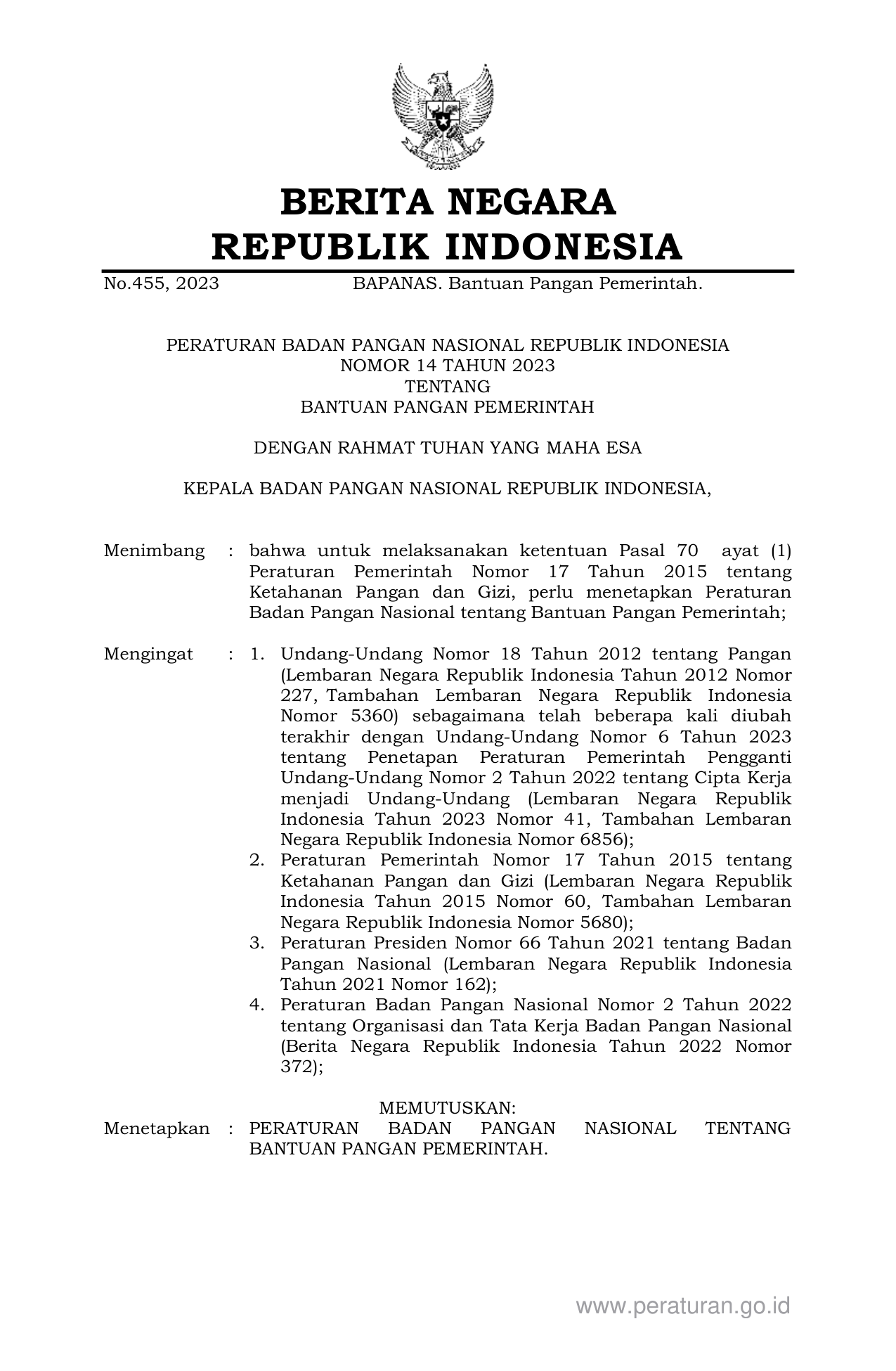 PERBAN Nomor 14 Tahun 2023 | Peraturan Badan Nomor 14 Tahun 2023 tentang BANTUAN PANGAN PEMERINTAH