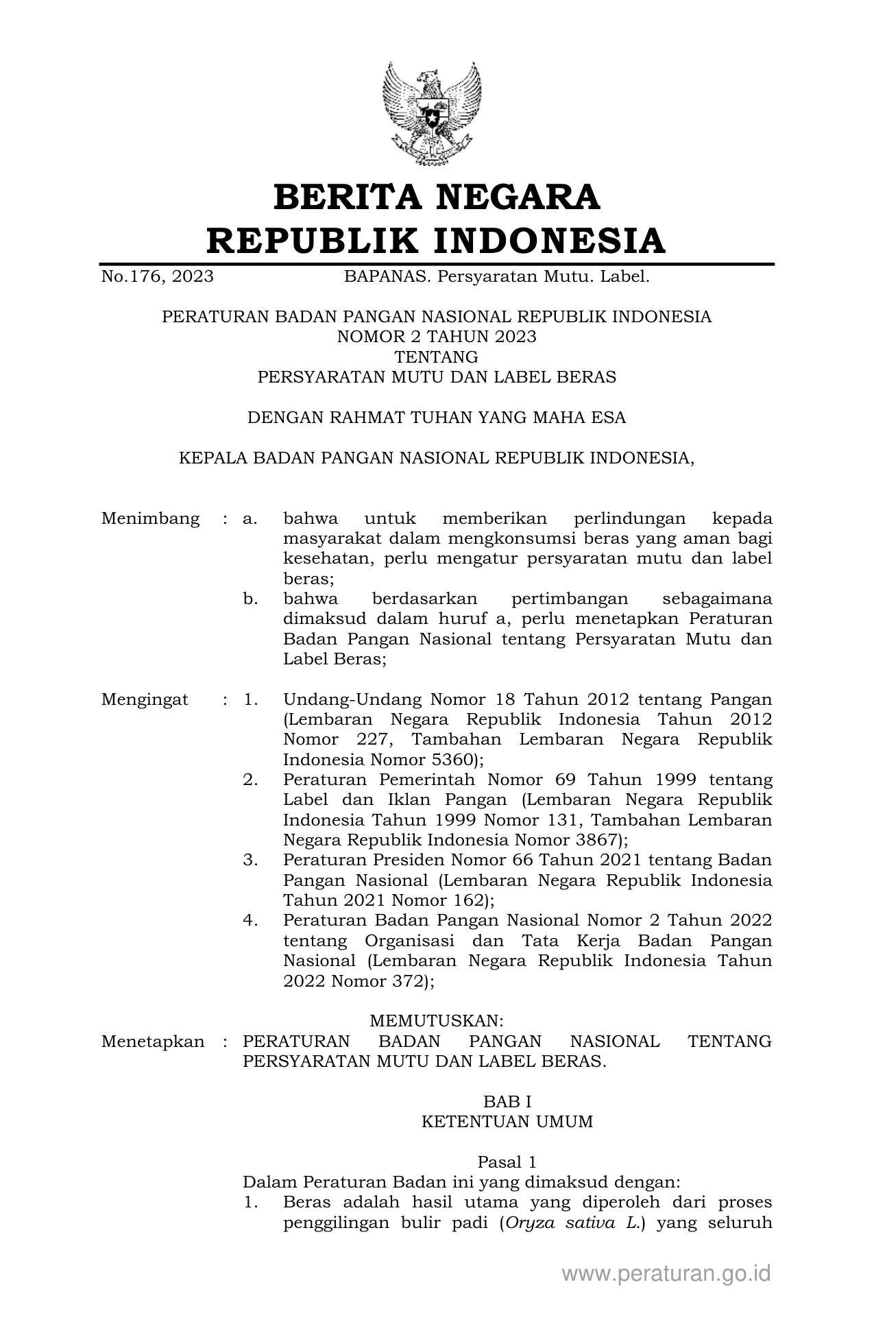 PERBAN Nomor 2 Tahun 2023 | Peraturan Badan Nomor 2 Tahun 2023 tentang PERSYARATAN MUTU DAN LABEL BERAS