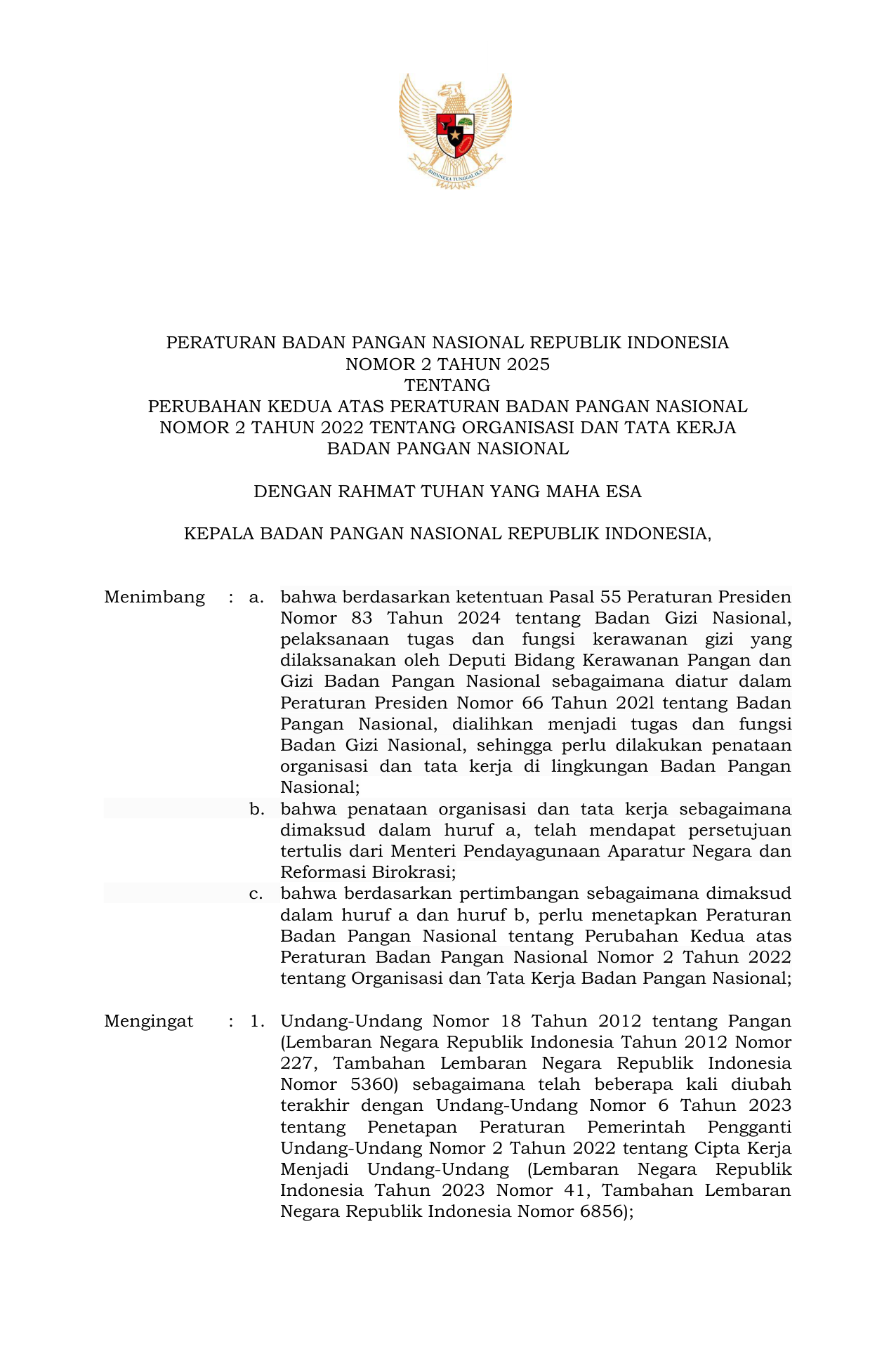 PERBAN Nomor 2 Tahun 2025 | Peraturan Badan Nomor 2 Tahun 2025 tentang Perubahan Kedua atas Peraturan Badan Pangan Nasional Nomor 2 Tahun 2022 tentang Organisasi dan Tata Kerja Badan Pangan Nasional