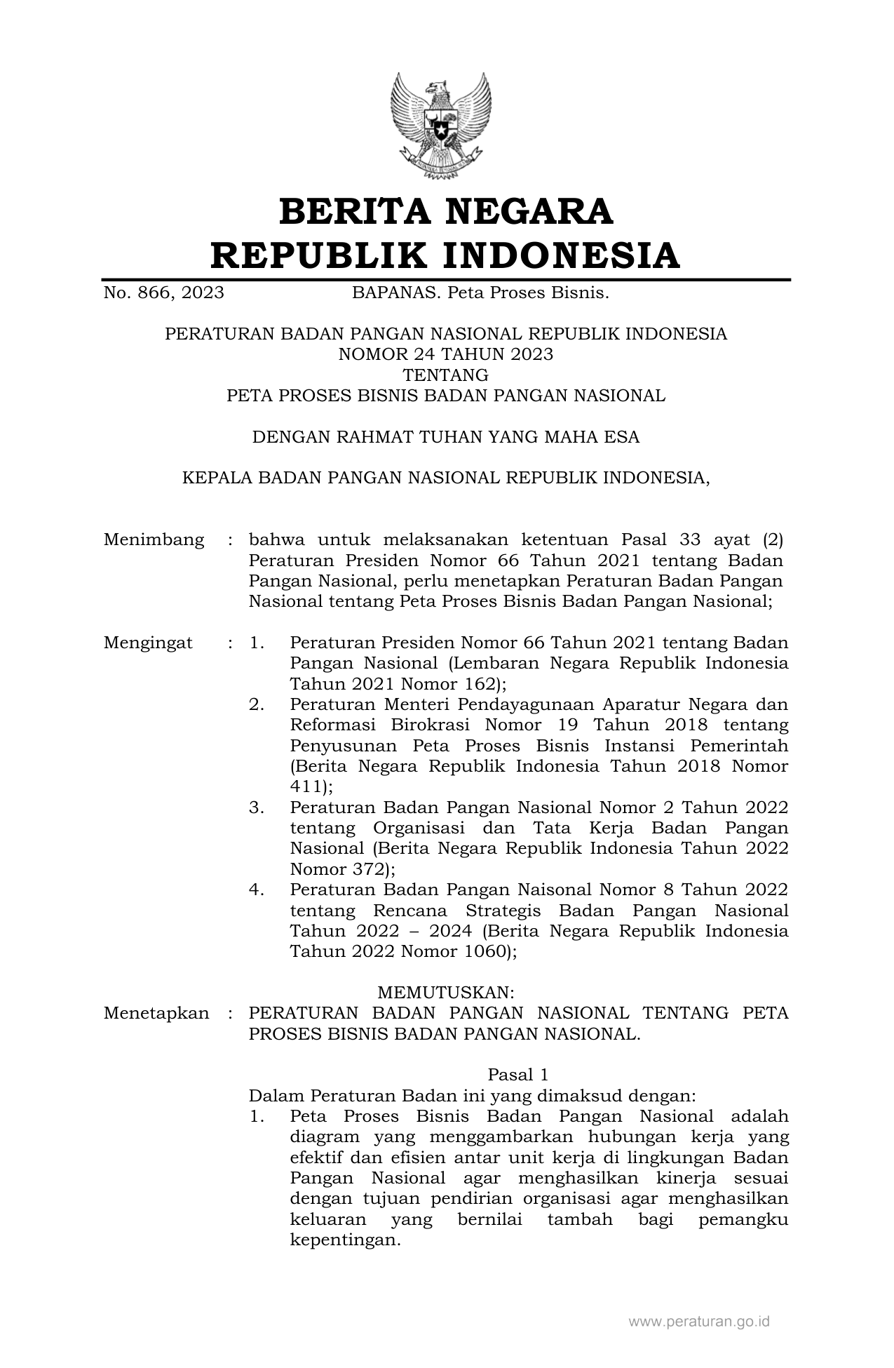 PERBAN Nomor 24 Tahun 2023 | Peraturan Badan Nomor 24 Tahun 2023 tentang PETA PROSES BISNIS BADAN PANGAN NASIONAL
