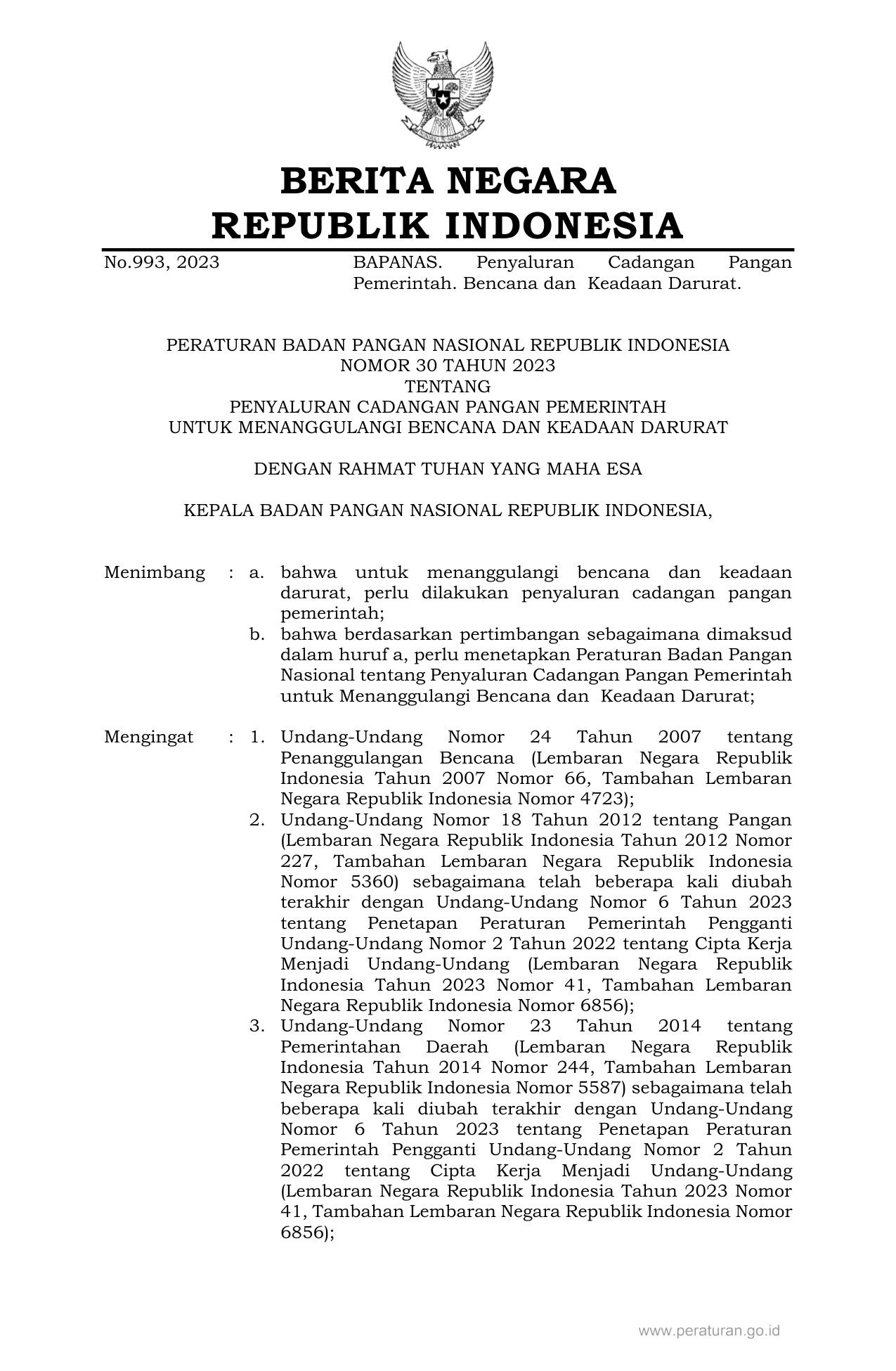 PERBAN Nomor 30 Tahun 2023 | Peraturan Badan Nomor 30 Tahun 2023 tentang PENYALURAN CADANGAN PANGAN PEMERINTAH UNTUK MENANGGULANGI BENCANA DAN KEADAAN DARURAT