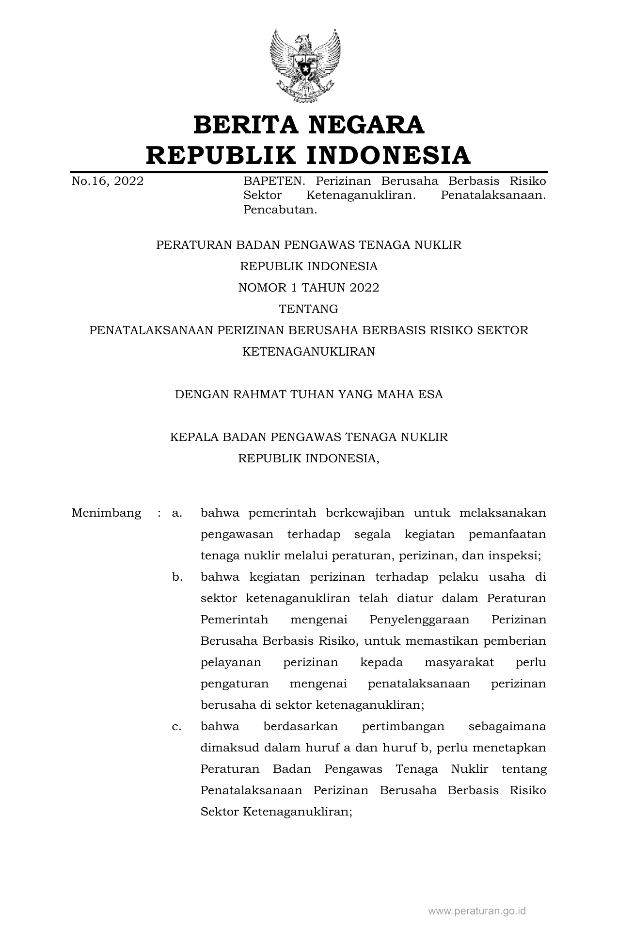 PERBAN Nomor 1 Tahun 2022 | Peraturan Badan Nomor 1 Tahun 2022 tentang PENATALAKSANAAN PERIZINAN BERUSAHA BERBASIS RISIKO SEKTOR KETENAGANUKLIRAN