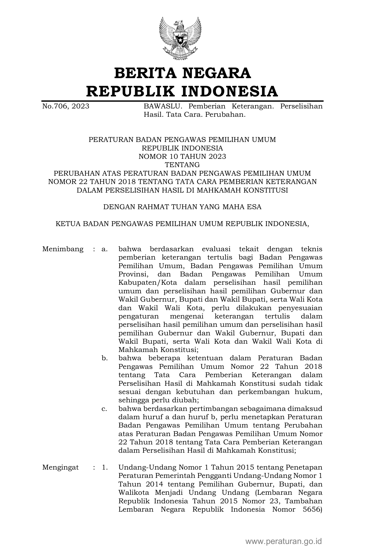 PERBAN Nomor 10 Tahun 2023 | Peraturan Badan Nomor 10 Tahun 2023 tentang PERUBAHAN ATAS PERATURAN BADAN PENGAWAS PEMILIHAN UMUM NOMOR 22 TAHUN 2018 TENTANG TATA CARA PEMBERIAN KETERANGAN DALAM PERSELISIHAN HASIL DI MAHKAMAH KONSTITUSI