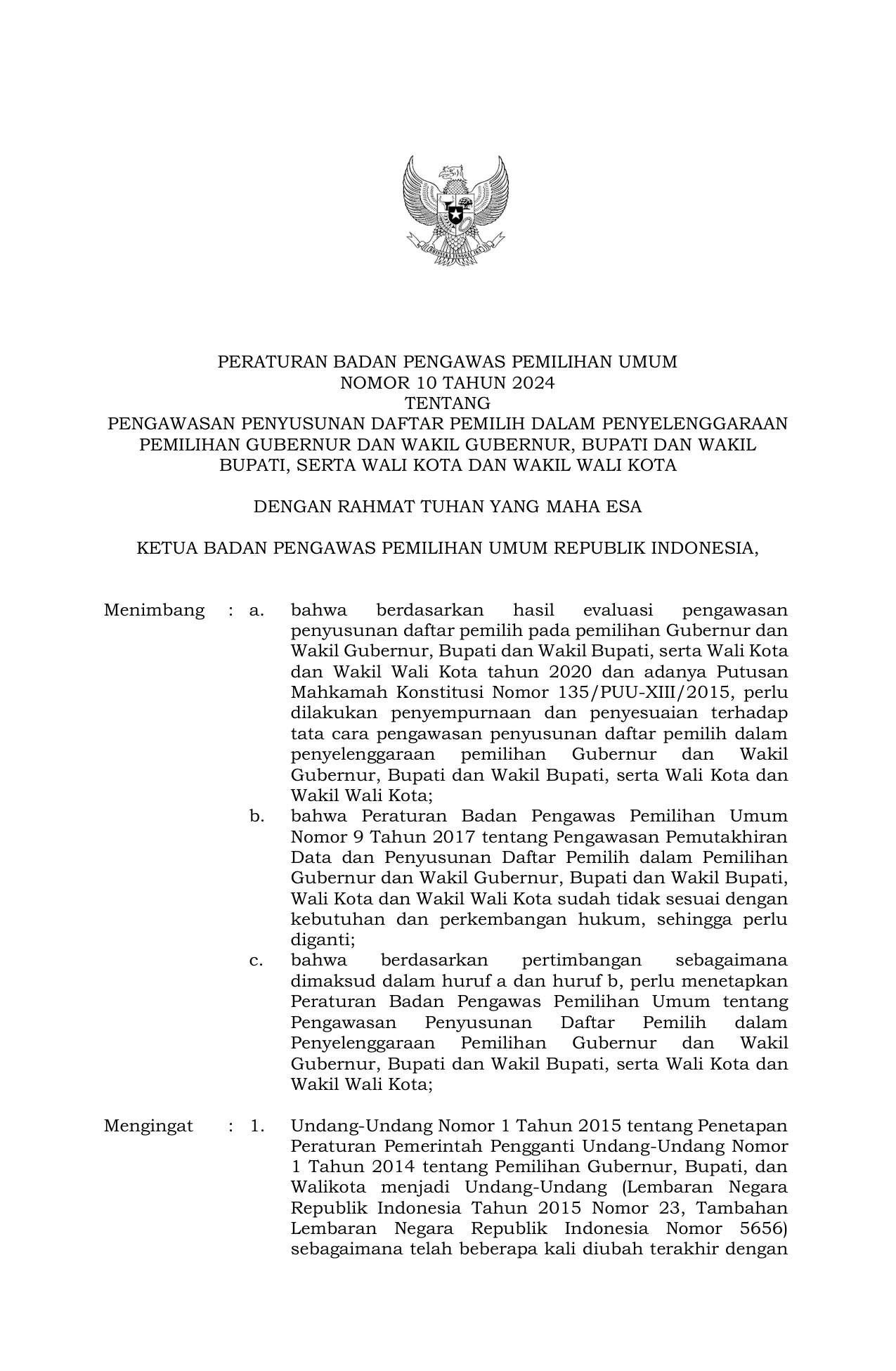 PERBAN Nomor 10 Tahun 2024 | Peraturan Badan Nomor 10 Tahun 2024 tentang Pengawasan Penyusunan Daftar Pemilih dalam Penyelenggaraan Pemilihan Gubernur dan Wakil Gubernur, Bupati dan Wakil Bupati, serta Wali Kota dan Wakil Wali Kota