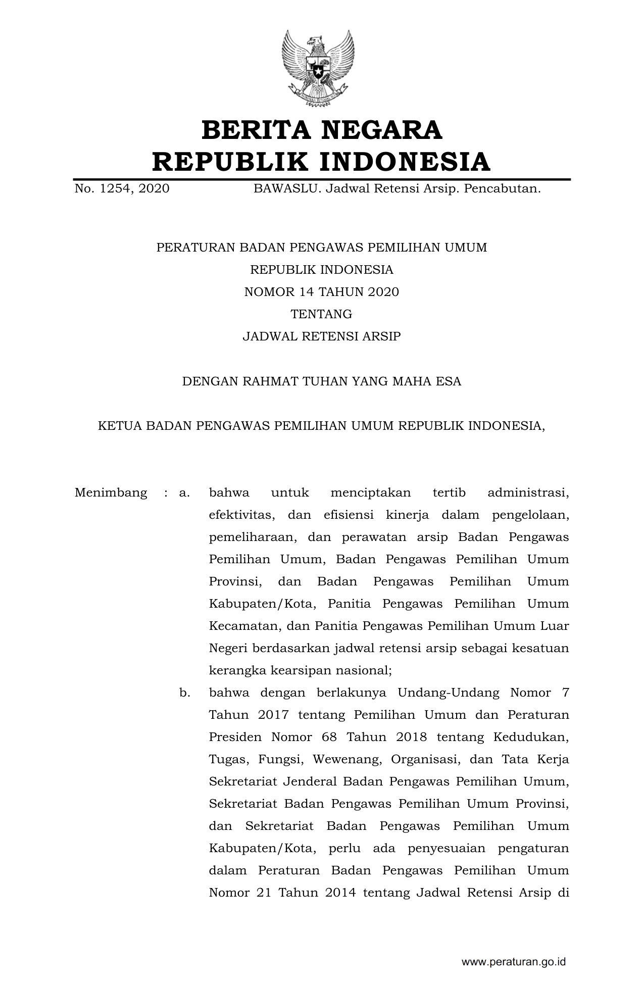 PERBAN Nomor 14 Tahun 2020 | Peraturan Badan Nomor 14 Tahun 2020 tentang JADWAL RETENSI ARSIP
