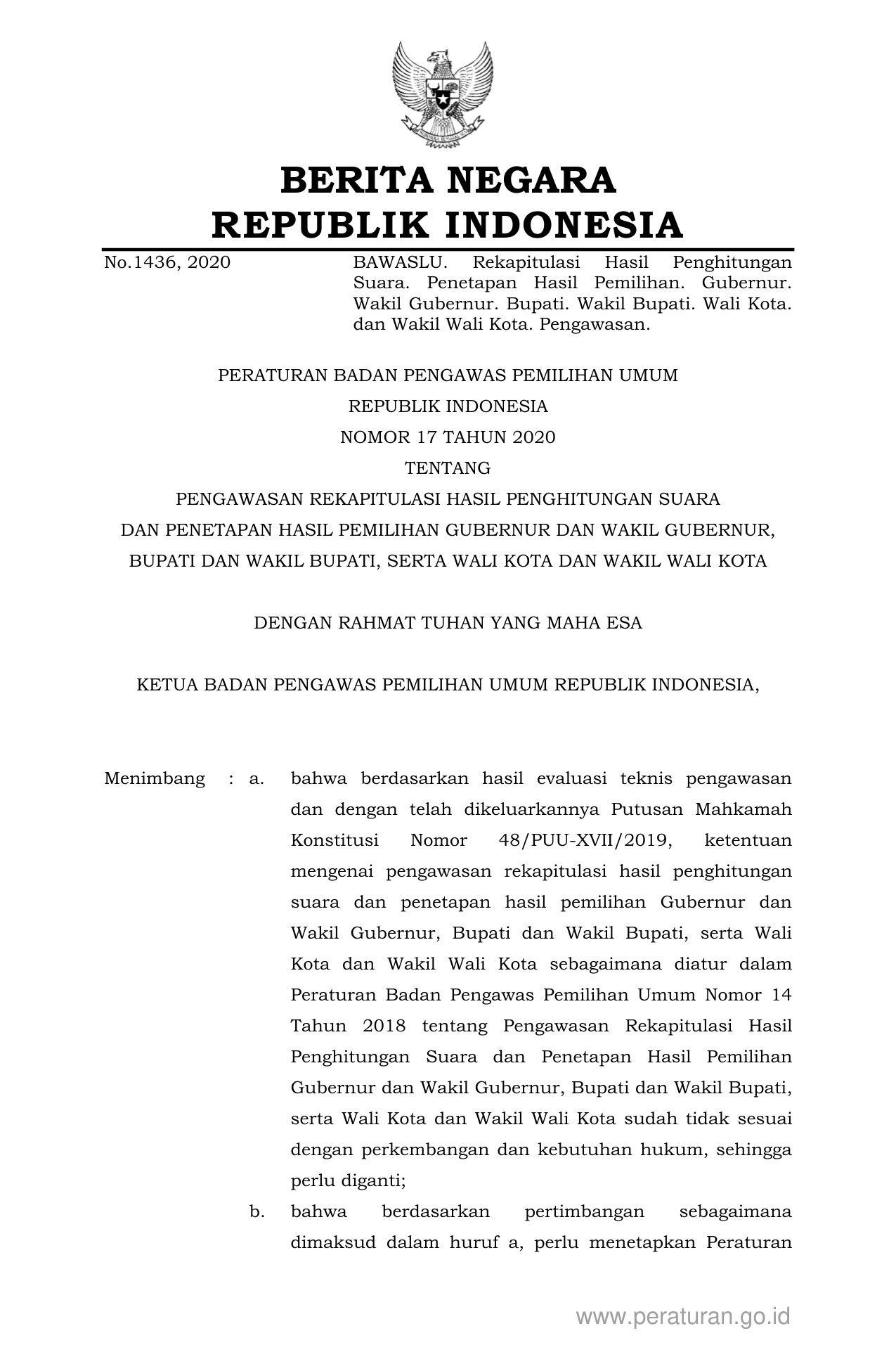 PERBAN Nomor 17 Tahun 2020 | Peraturan Badan Nomor 17 Tahun 2020 tentang PENGAWASAN REKAPITULASI HASIL PENGHITUNGAN SUARA DAN PENETAPAN HASIL PEMILIHAN GUBERNUR DAN WAKIL GUBERNUR, BUPATI DAN WAKIL BUPATI, SERTA WALI KOTA DAN WAKIL WALI KOTA