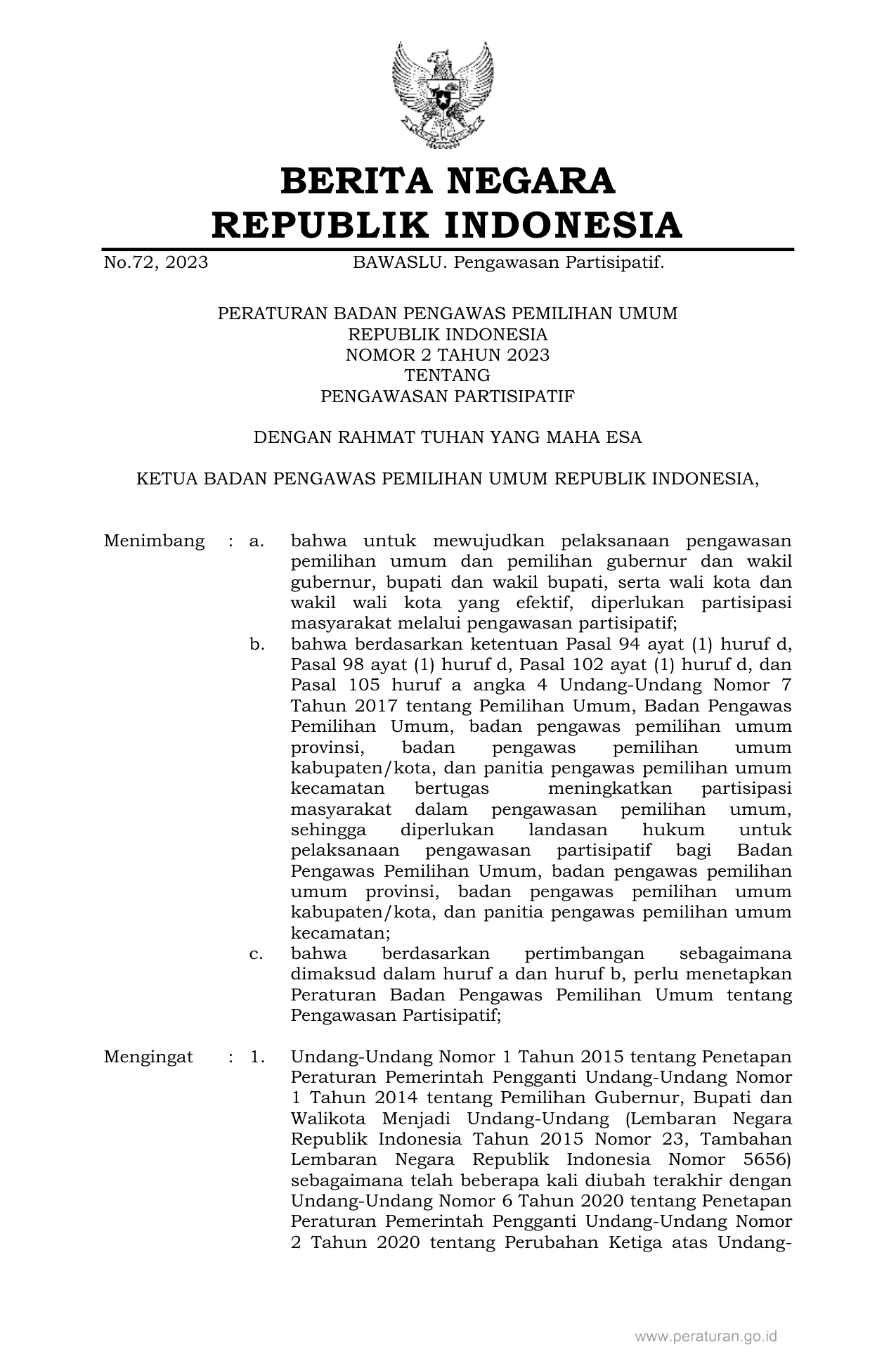 PERBAN Nomor 2 Tahun 2023 | Peraturan Badan Nomor 2 Tahun 2023 tentang PENGAWASAN PARTISIPATIF