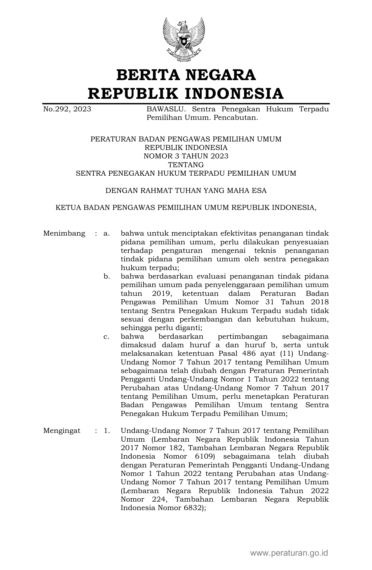 PERBAN Nomor 3 Tahun 2023 | Peraturan Badan Nomor 3 Tahun 2023 tentang SENTRA PENEGAKAN HUKUM TERPADU PEMILIHAN UMUM