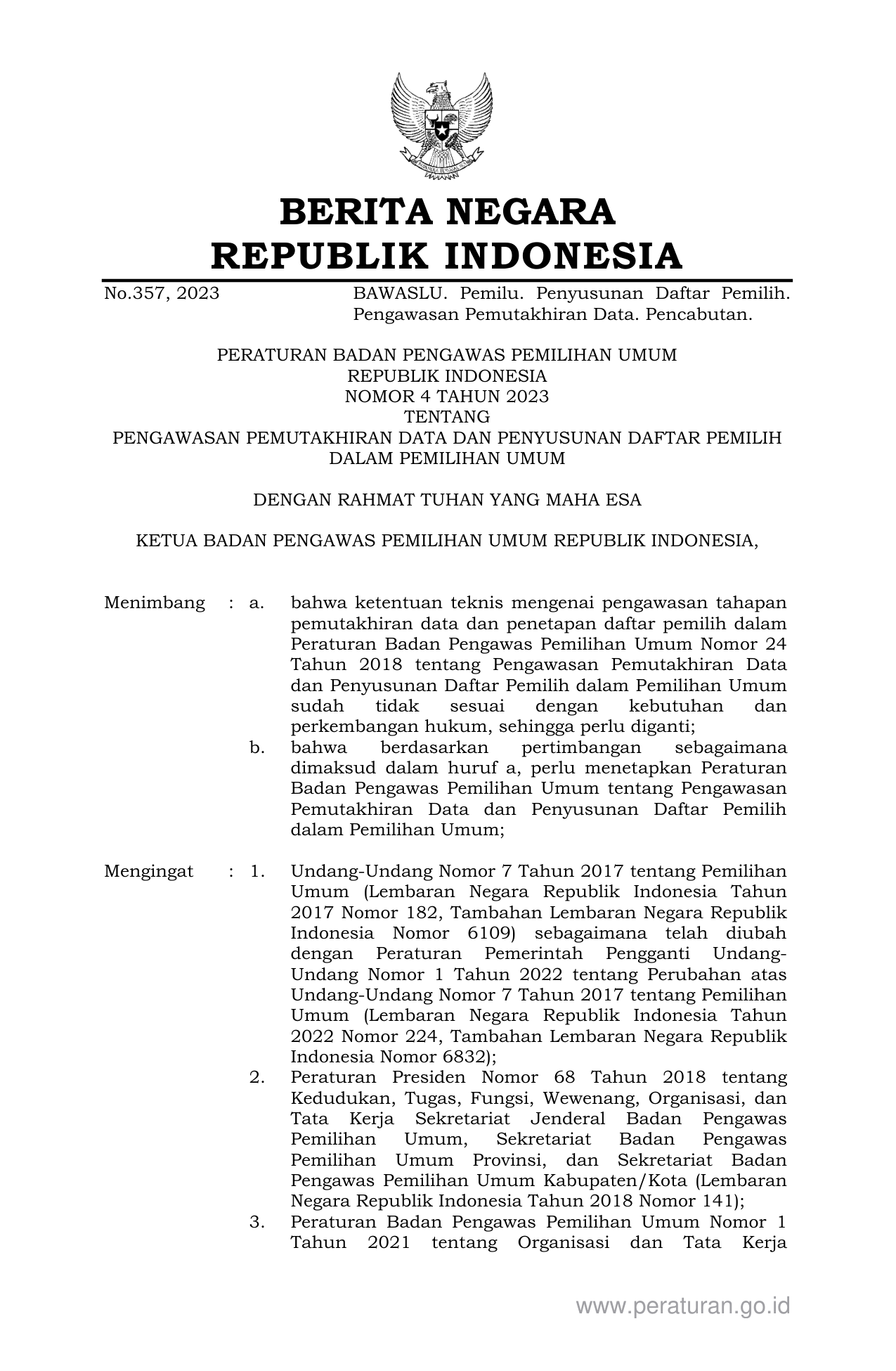 PERBAN Nomor 4 Tahun 2023 | Peraturan Badan Nomor 4 Tahun 2023 tentang PENGAWASAN PEMUTAKHIRAN DATA DAN PENYUSUNAN DAFTAR PEMILIH DALAM PEMILIHAN UMUM