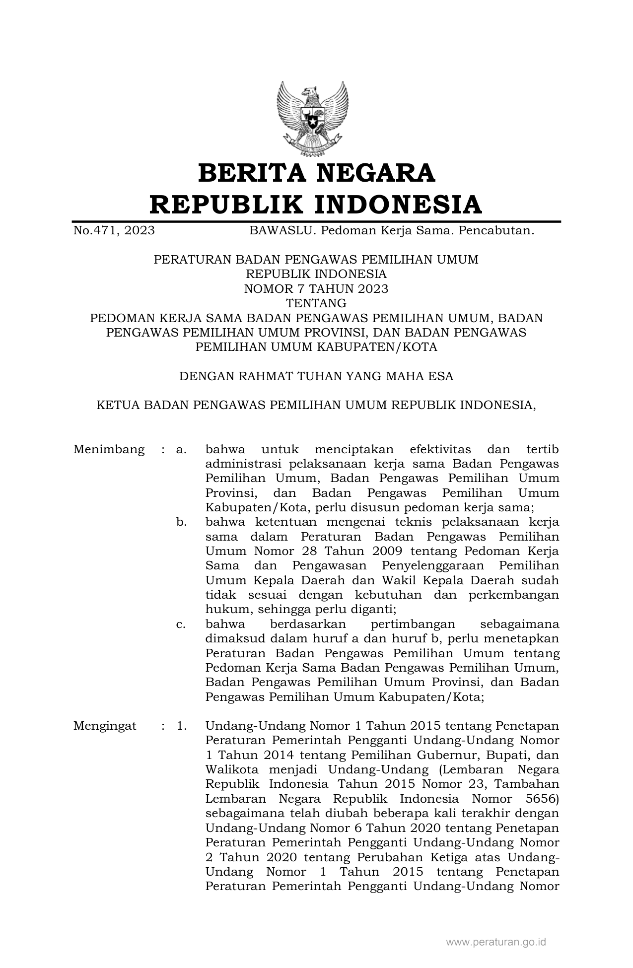 PERBAN Nomor 7 Tahun 2023 | Peraturan Badan Nomor 7 Tahun 2023 tentang PEDOMAN KERJA SAMA BADAN PENGAWAS PEMILIHAN UMUM, BADAN PENGAWAS PEMILIHAN UMUM PROVINSI, DAN BADAN PENGAWAS PEMILIHAN UMUM KABUPATEN/KOTA