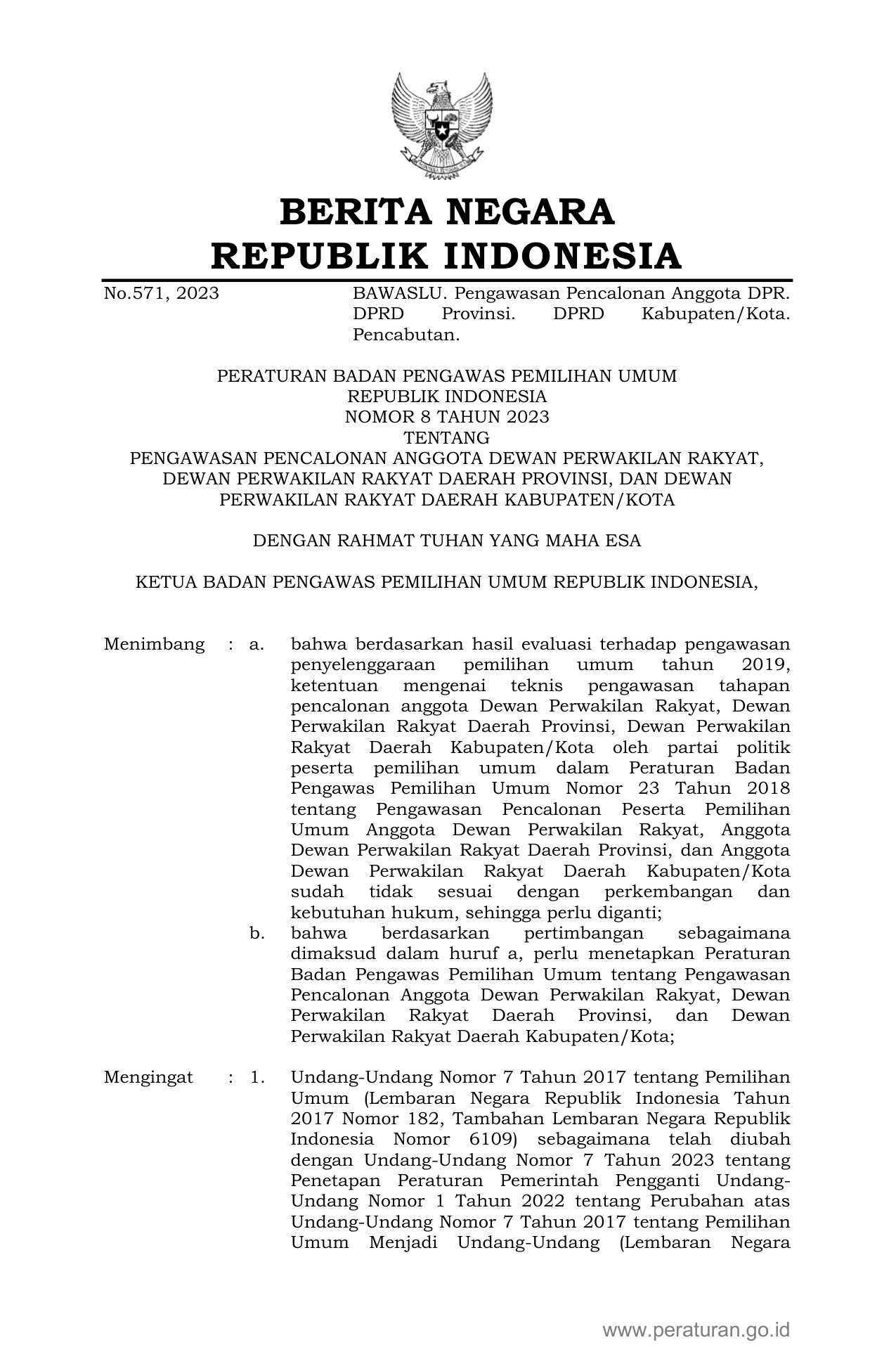 PERBAN Nomor 8 Tahun 2023 | Peraturan Badan Nomor 8 Tahun 2023 tentang PENGAWASAN PENCALONAN ANGGOTA DEWAN PERWAKILAN RAKYAT, DEWAN PERWAKILAN RAKYAT DAERAH PROVINSI, DAN DEWAN PERWAKILAN RAKYAT DAERAH KABUPATEN/KOTA