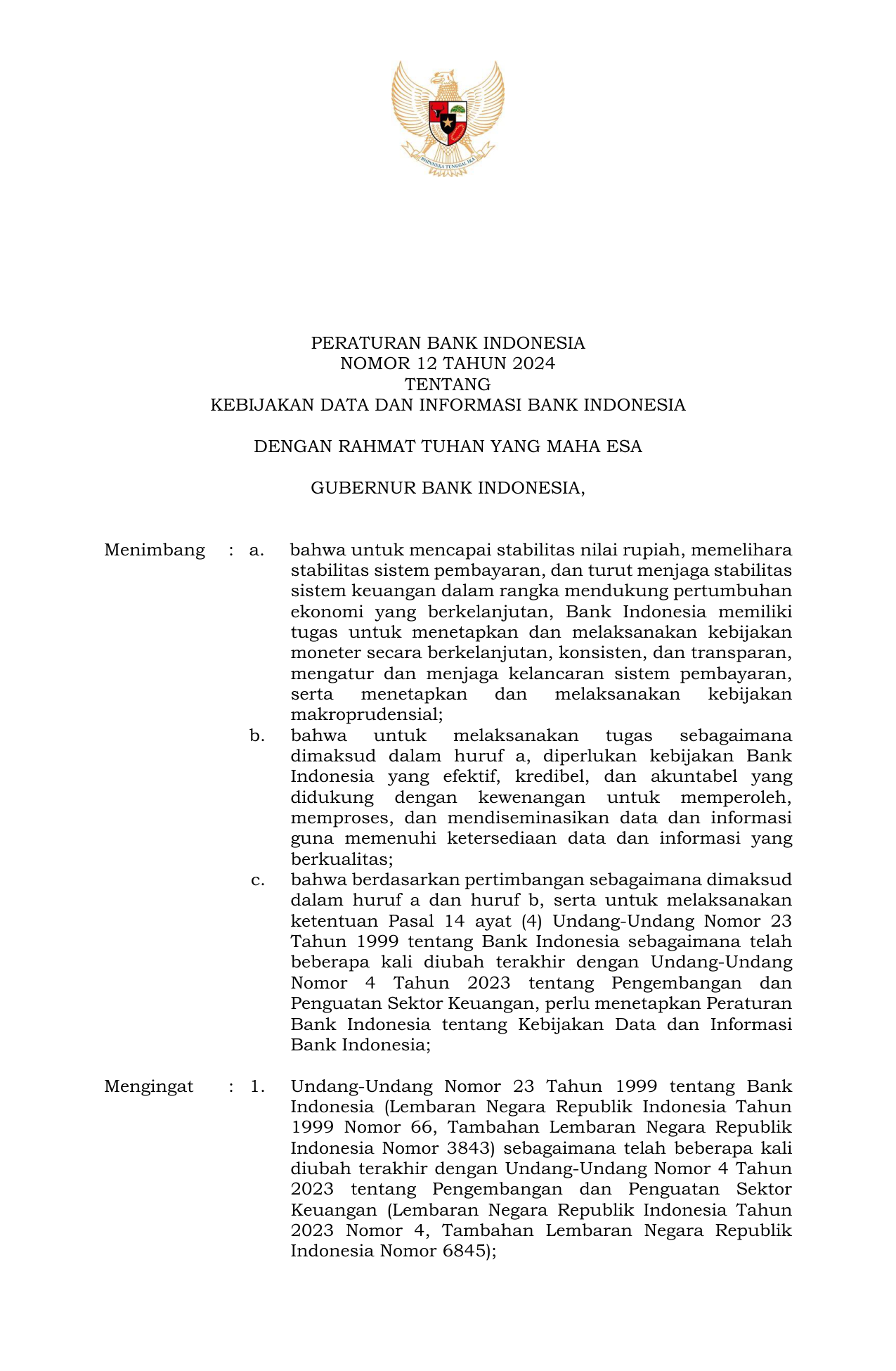 PERBAN Nomor 12 Tahun 2024 | Peraturan Badan Nomor 12 Tahun 2024 tentang Kebijakan Data dan Informasi Bank Indonesia