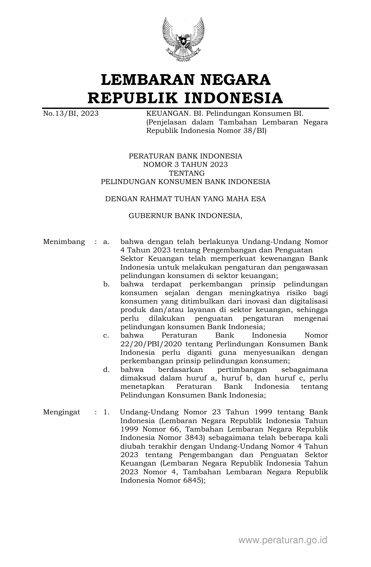 PERBAN Nomor 3 Tahun 2023 | Peraturan Badan Nomor 3 Tahun 2023 tentang PELINDUNGAN KONSUMEN BANK INDONESIA