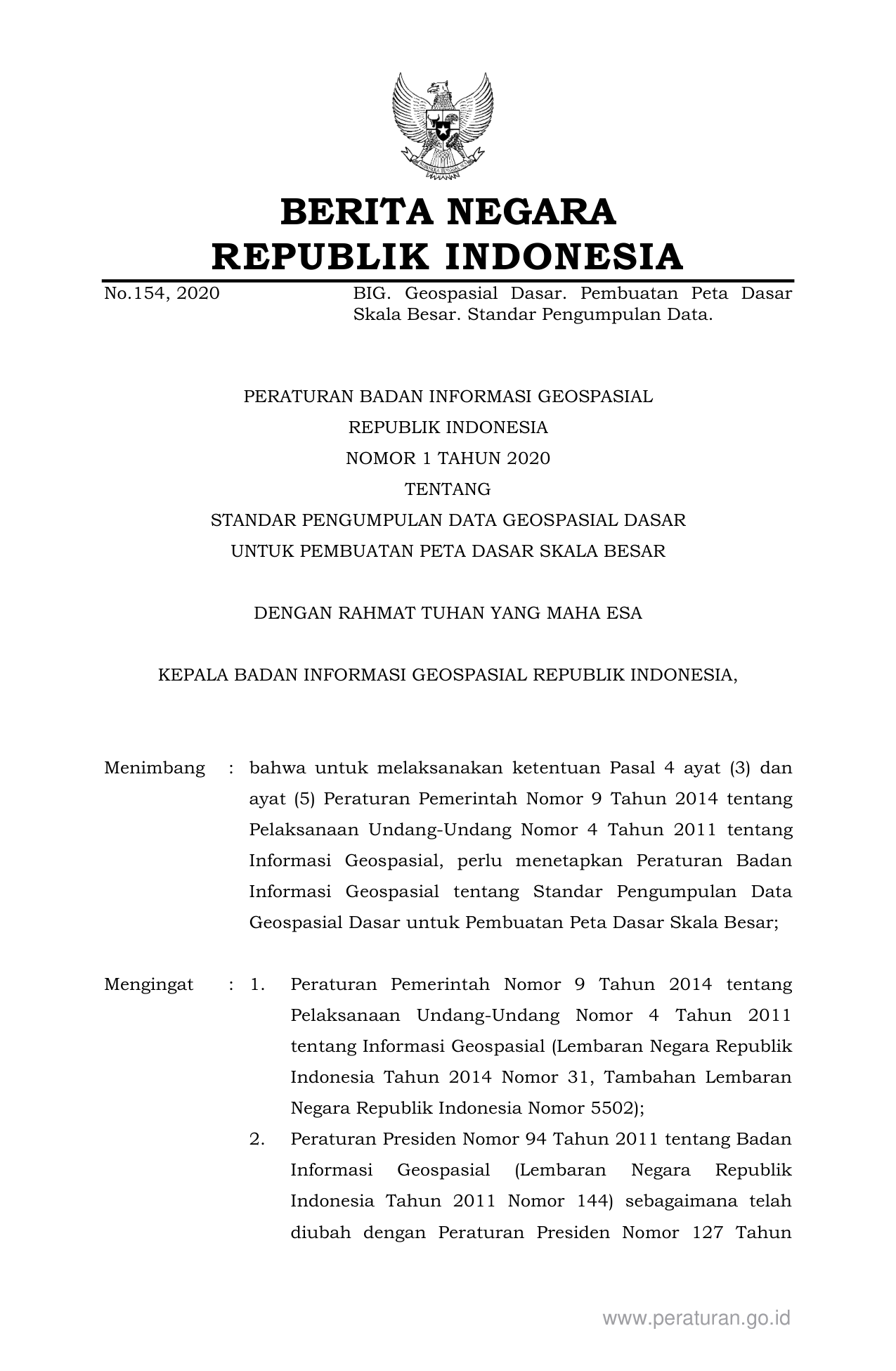 PERBAN Nomor 1 Tahun 2020 | Peraturan Badan Nomor 1 Tahun 2020 tentang STANDAR PENGUMPULAN DATA GEOSPASIAL DASAR UNTUK PEMBUATAN PETA DASAR SKALA BESAR