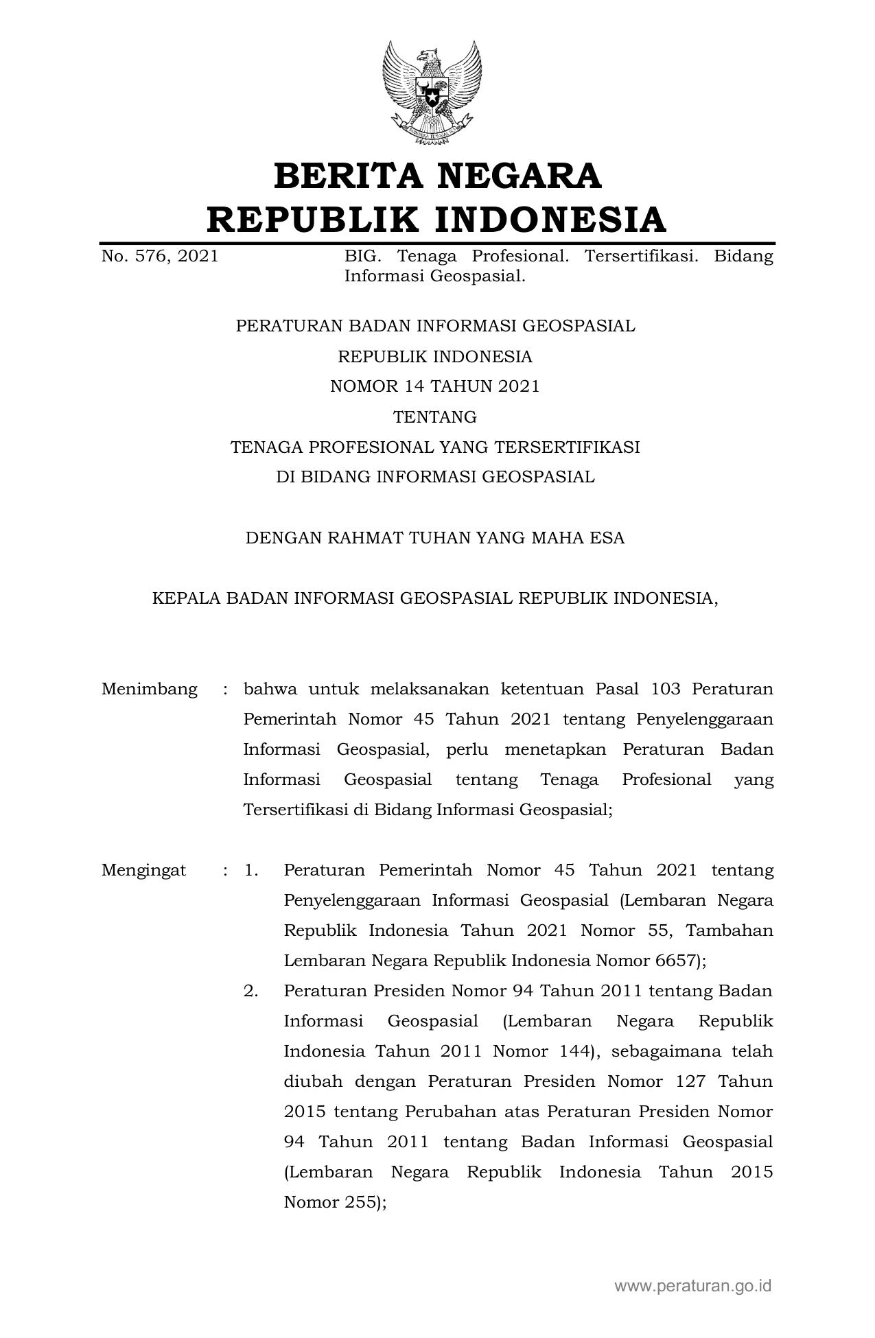 PERBAN Nomor 14 Tahun 2021 | Peraturan Badan Nomor 14 Tahun 2021 tentang TENAGA PROFESIONAL YANG TERSERTIFIKASI DI BIDANG INFORMASI GEOSPASIAL