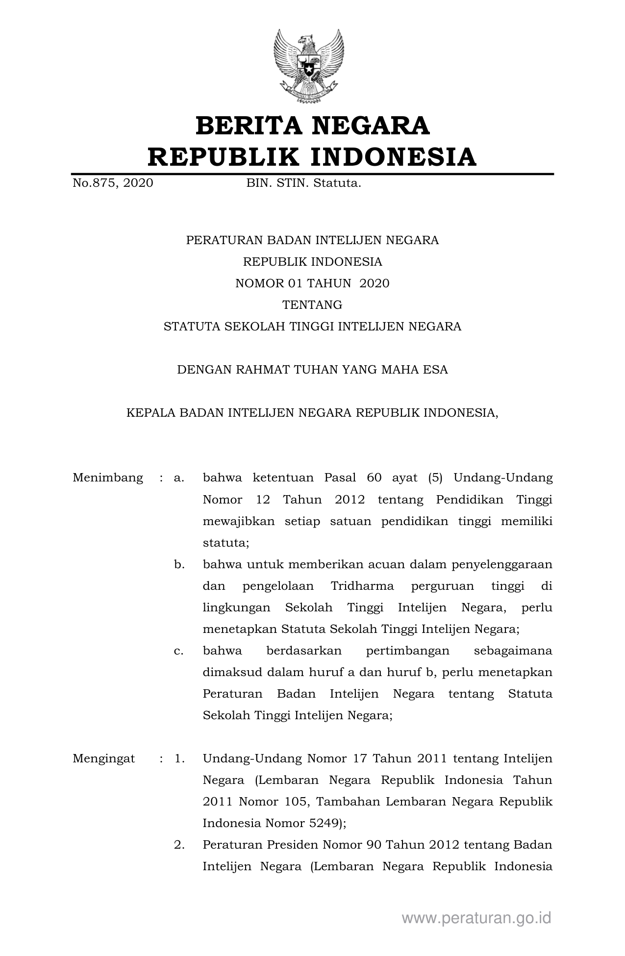 PERBAN Nomor 01 Tahun 2020 | Peraturan Badan Nomor 01 Tahun 2020 tentang STATUTA SEKOLAH TINGGI INTELIJEN NEGARA