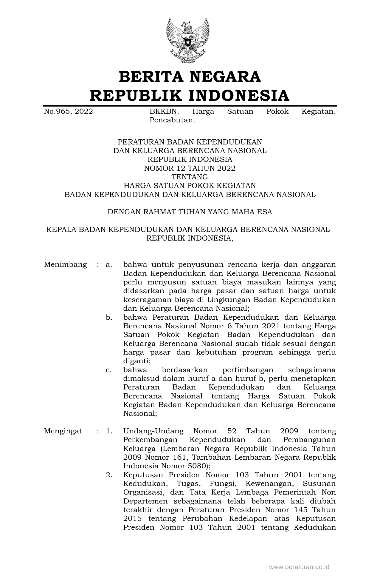 PERBAN Nomor 12 Tahun 2022 | Peraturan Badan Nomor 12 Tahun 2022 tentang HARGA SATUAN POKOK KEGIATAN BADAN KEPENDUDUKAN DAN KELUARGA BERENCANA NASIONAL