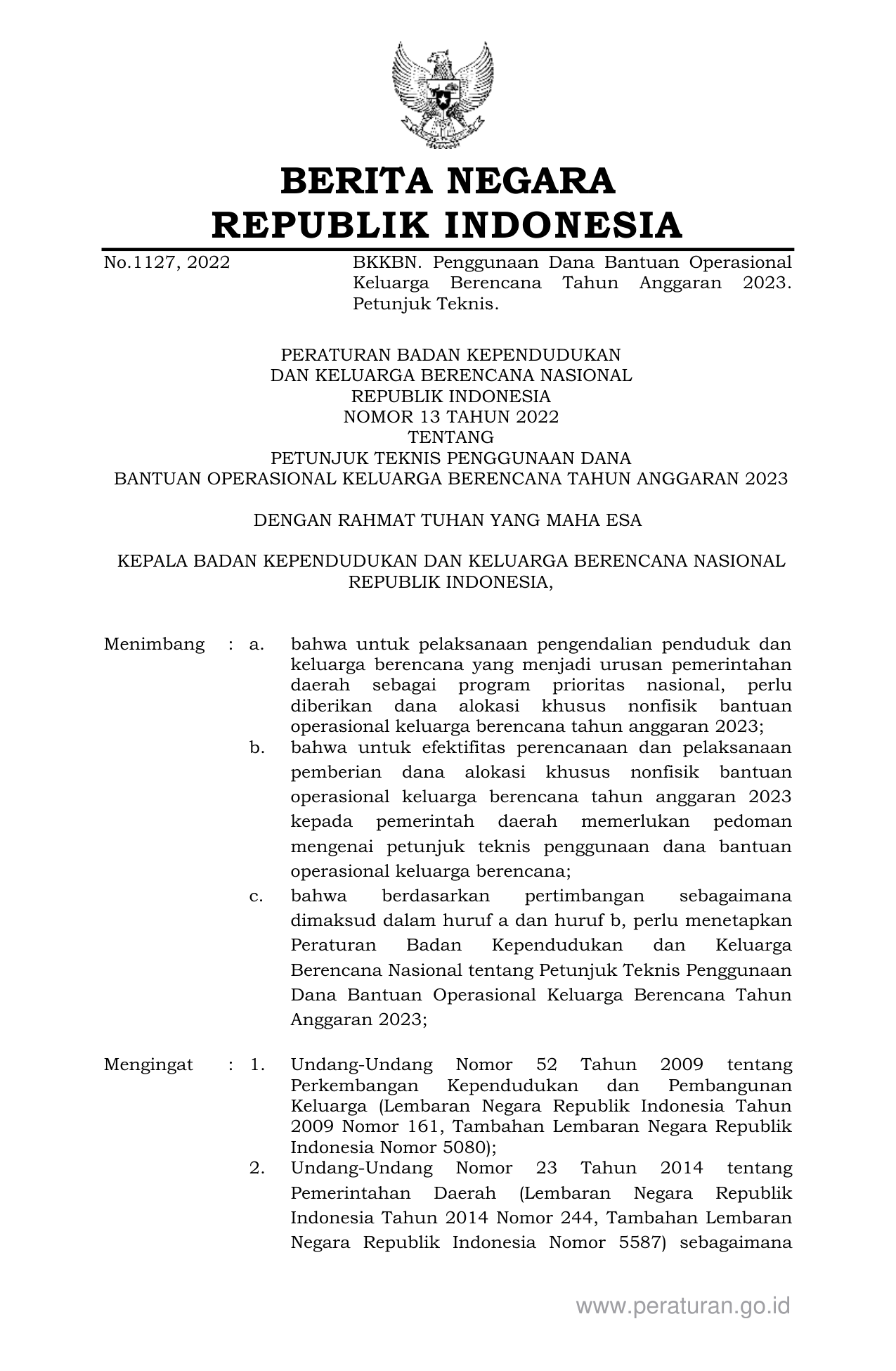 PERBAN Nomor 13 Tahun 2022 | Peraturan Badan Nomor 13 Tahun 2022 tentang PETUNJUK TEKNIS PENGGUNAAN DANA BANTUAN OPERASIONAL KELUARGA BERENCANA TAHUN ANGGARAN 2023