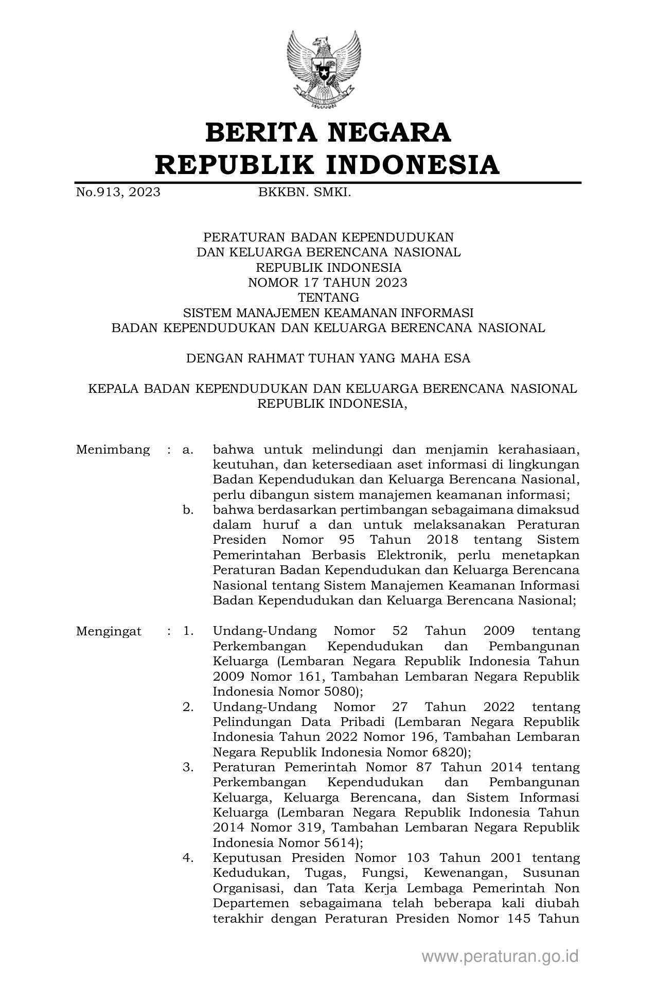 PERBAN Nomor 17 Tahun 2023 | Peraturan Badan Nomor 17 Tahun 2023 tentang SISTEM MANAJEMEN KEAMANAN INFORMASI BADAN KEPENDUDUKAN DAN KELUARGA BERENCANA NASIONAL