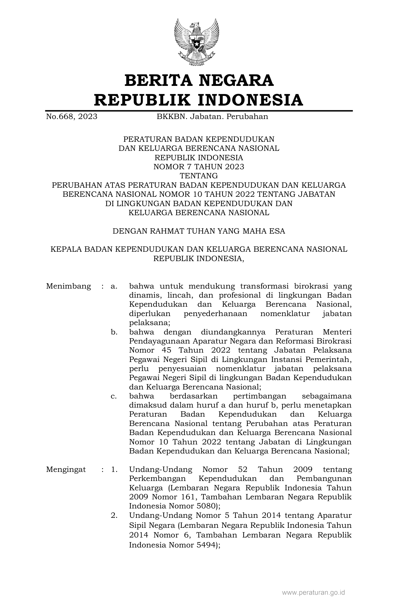 PERBAN Nomor 7 Tahun 2023 | Peraturan Badan Nomor 7 Tahun 2023 tentang PERUBAHAN ATAS PERATURAN BADAN KEPENDUDUKAN DAN KELUARGA BERENCANA NASIONAL NOMOR 10 TAHUN 2022 TENTANG JABATAN DI LINGKUNGAN BADAN KEPENDUDUKAN DAN KELUARGA BERENCANA NASIONAL