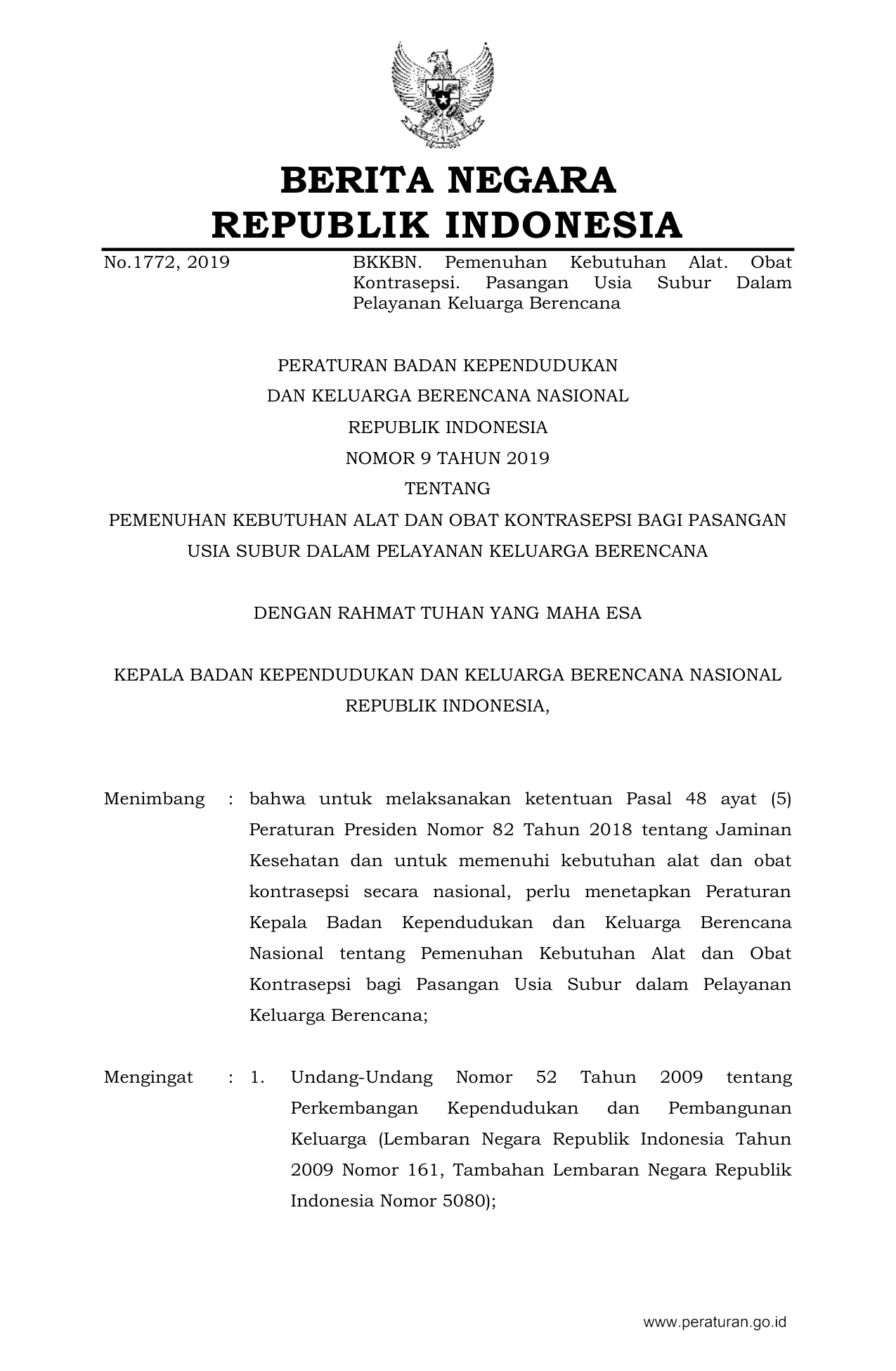 PERBAN Nomor 9 Tahun 2019 | Peraturan Badan Nomor 9 Tahun 2019 tentang PEMENUHAN KEBUTUHAN ALAT DAN OBAT KONTRASEPSI BAGI PASANGAN USIA SUBUR DALAM PELAYANAN KELUARGA BERENCANA
