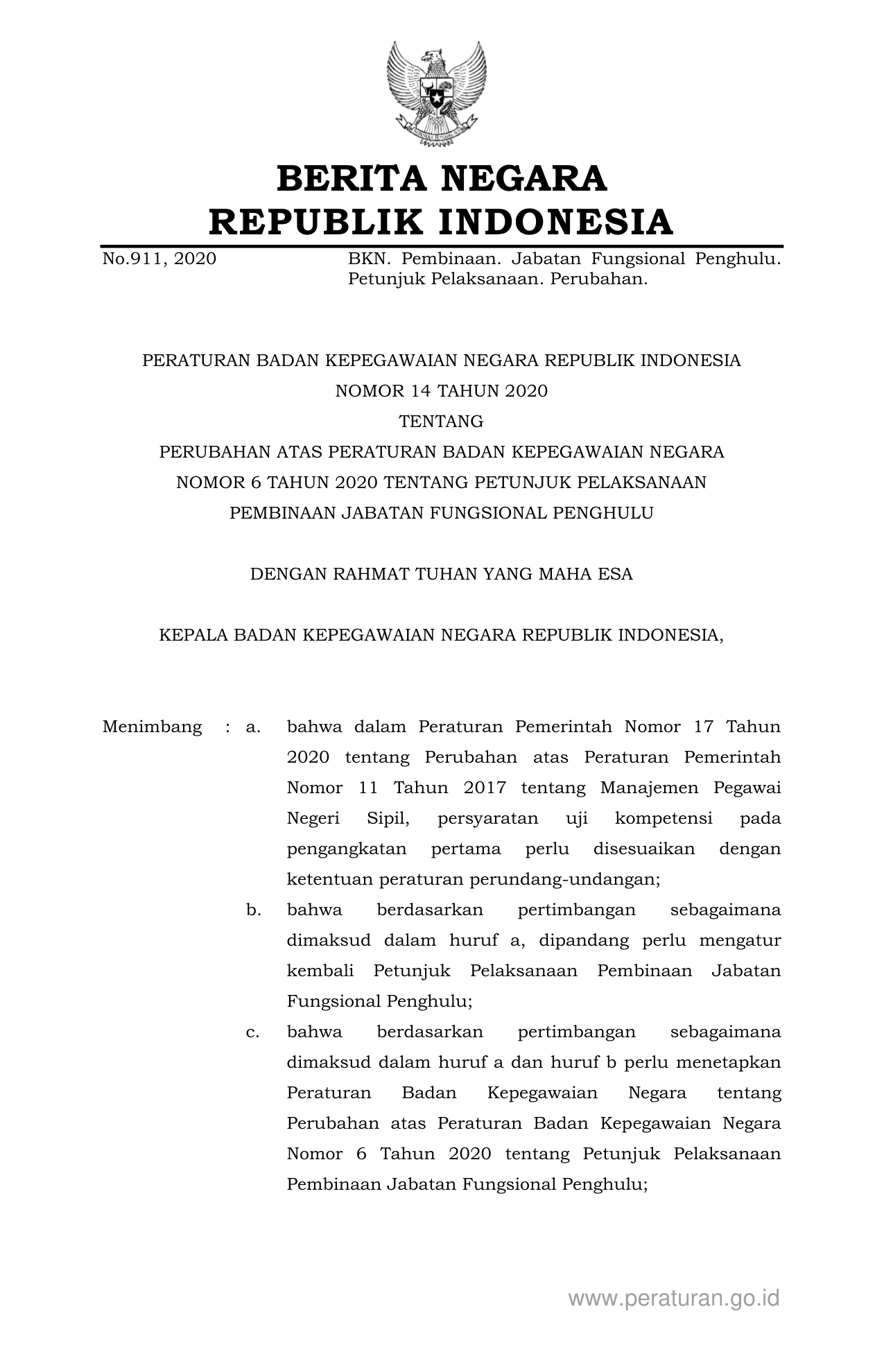 PERBAN Nomor 14 Tahun 2020 | Peraturan Badan Nomor 14 Tahun 2020 tentang PERUBAHAN ATAS PERATURAN BADAN KEPEGAWAIAN NEGARA NOMOR 6 TAHUN 2020 TENTANG PETUNJUK PELAKSANAAN PEMBINAAN JABATAN FUNGSIONAL PENGHULU
