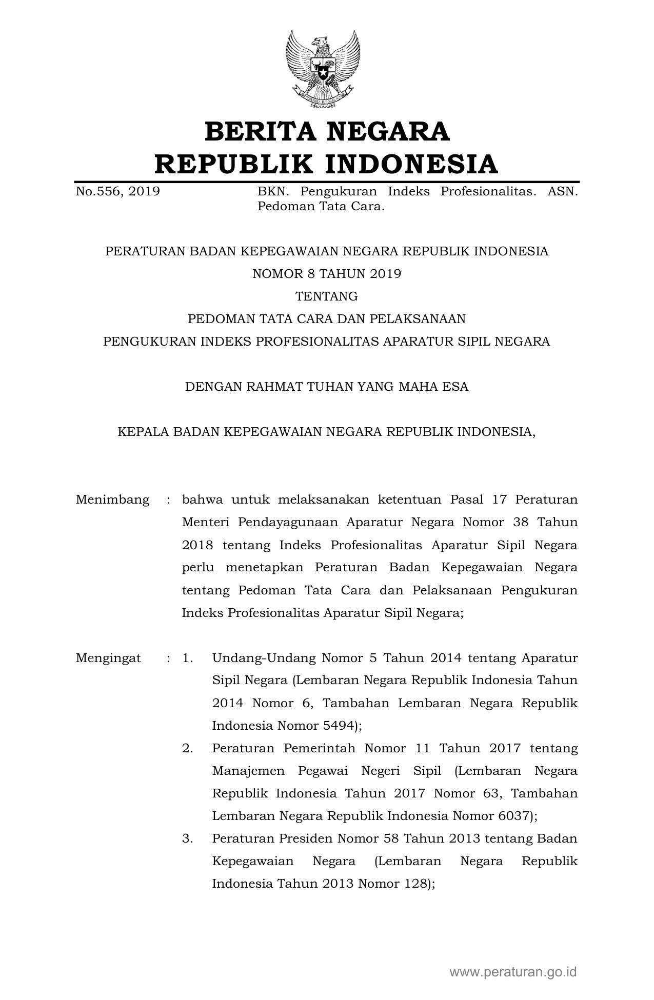 PERBAN Nomor 8 Tahun 2019 | Peraturan Badan Nomor 8 Tahun 2019 tentang PEDOMAN TATA CARA DAN PELAKSANAAN PENGUKURAN INDEKS PROFESIONALITAS APARATUR SIPIL NEGARA