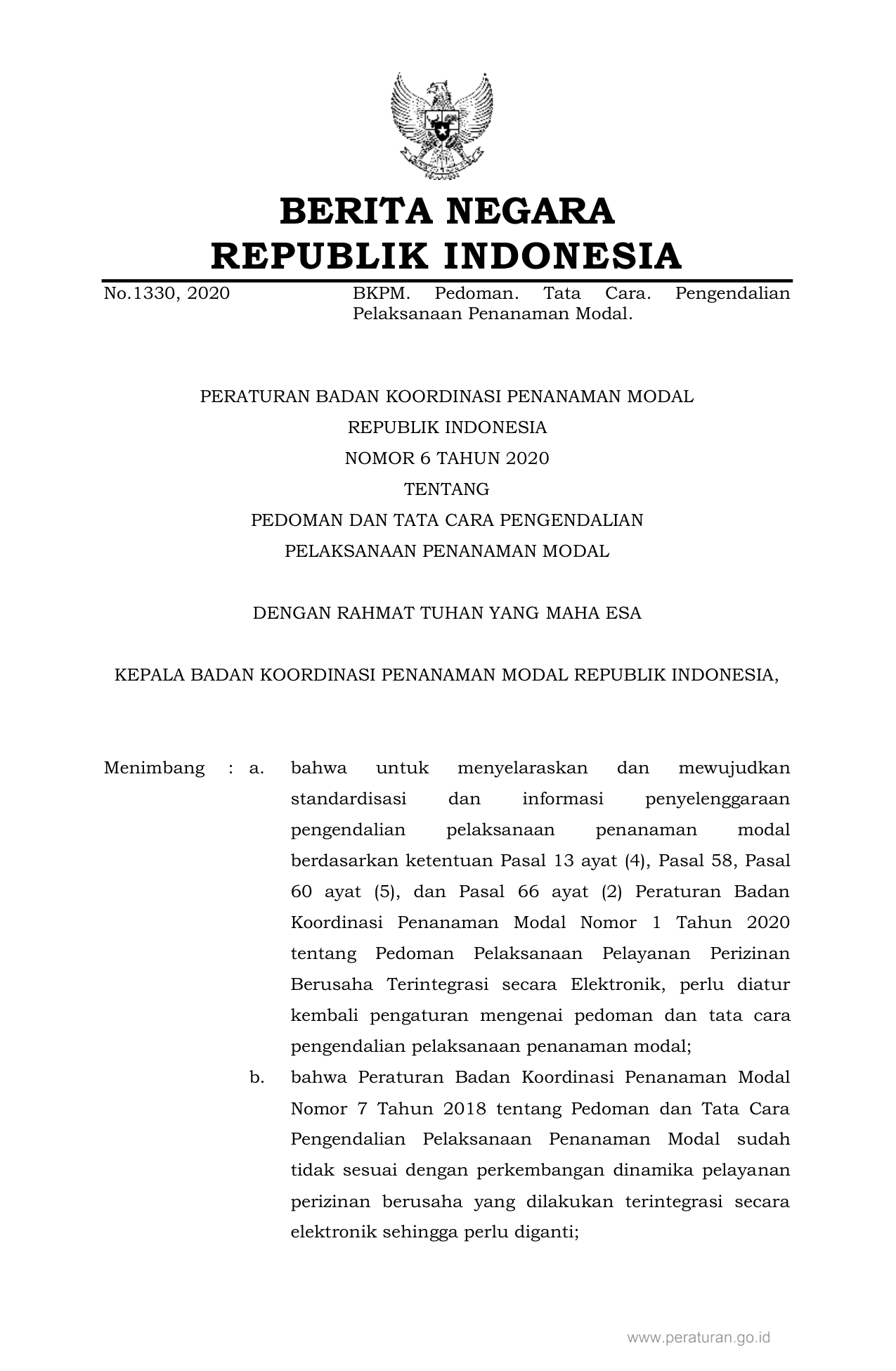 PERBAN Nomor 6 Tahun 2020 | Peraturan Badan Nomor 6 Tahun 2020 tentang PEDOMAN DAN TATA CARA PENGENDALIAN PELAKSANAAN PENANAMAN MODAL